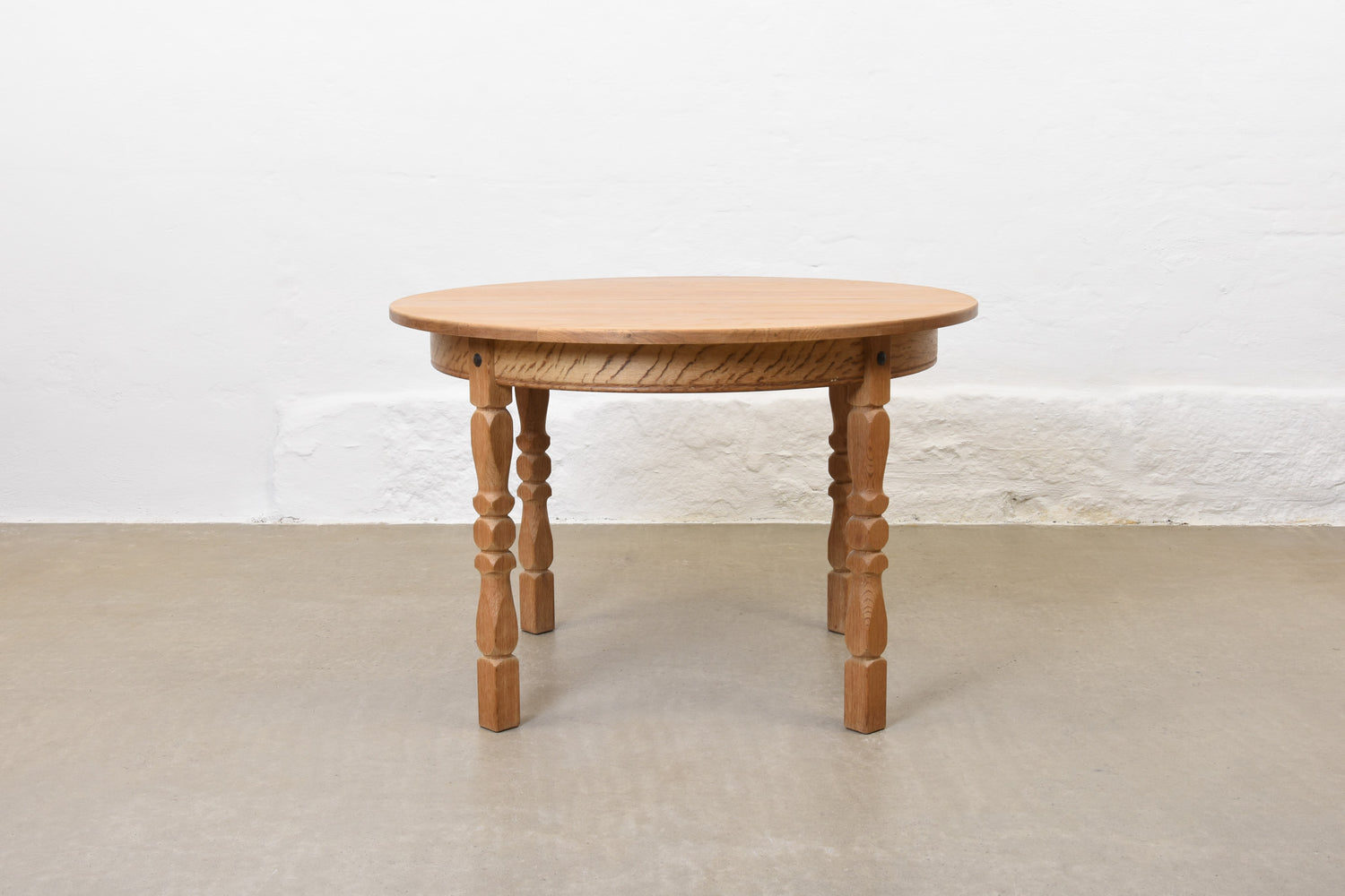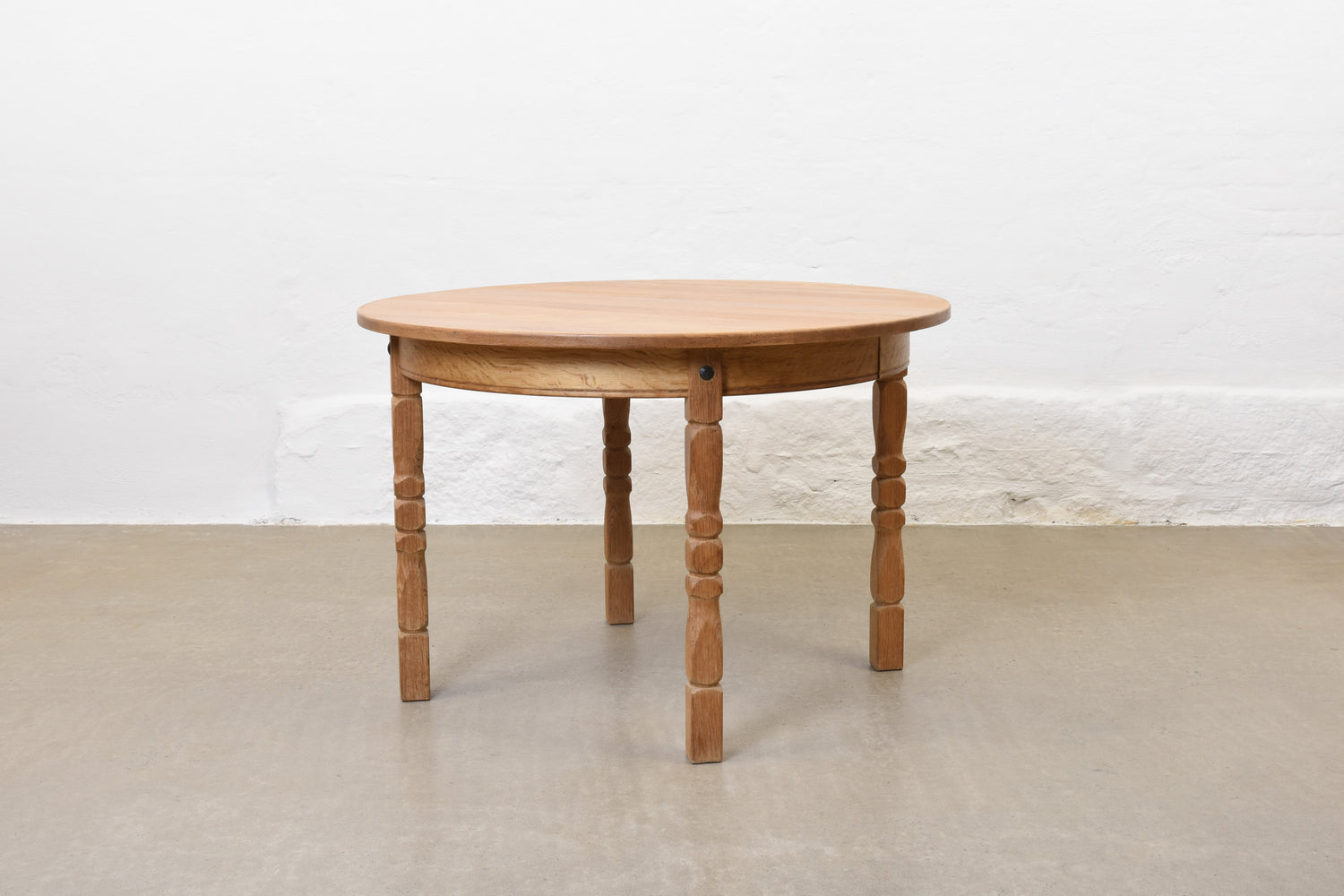 Round dining table in oak with drop-in extension leaves. Sits four normally and up to eight comfortably when fully extended.