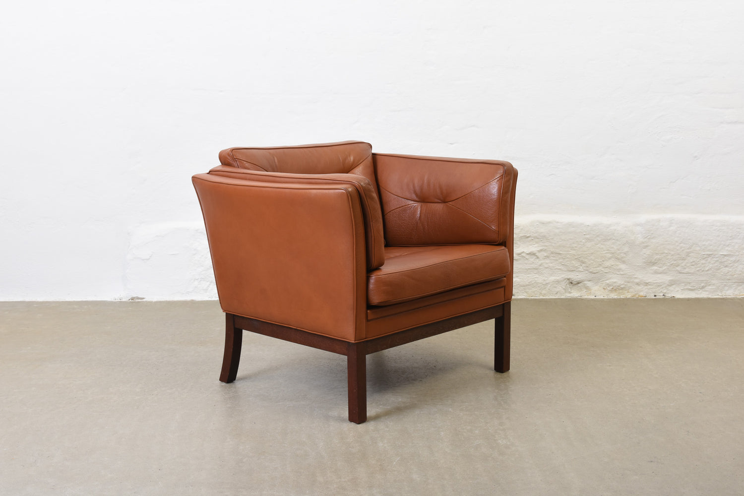 Vintage low back club chair upholstered in its original cognac leather. Features four loose foam filled cushions and sits on a stained beech base.