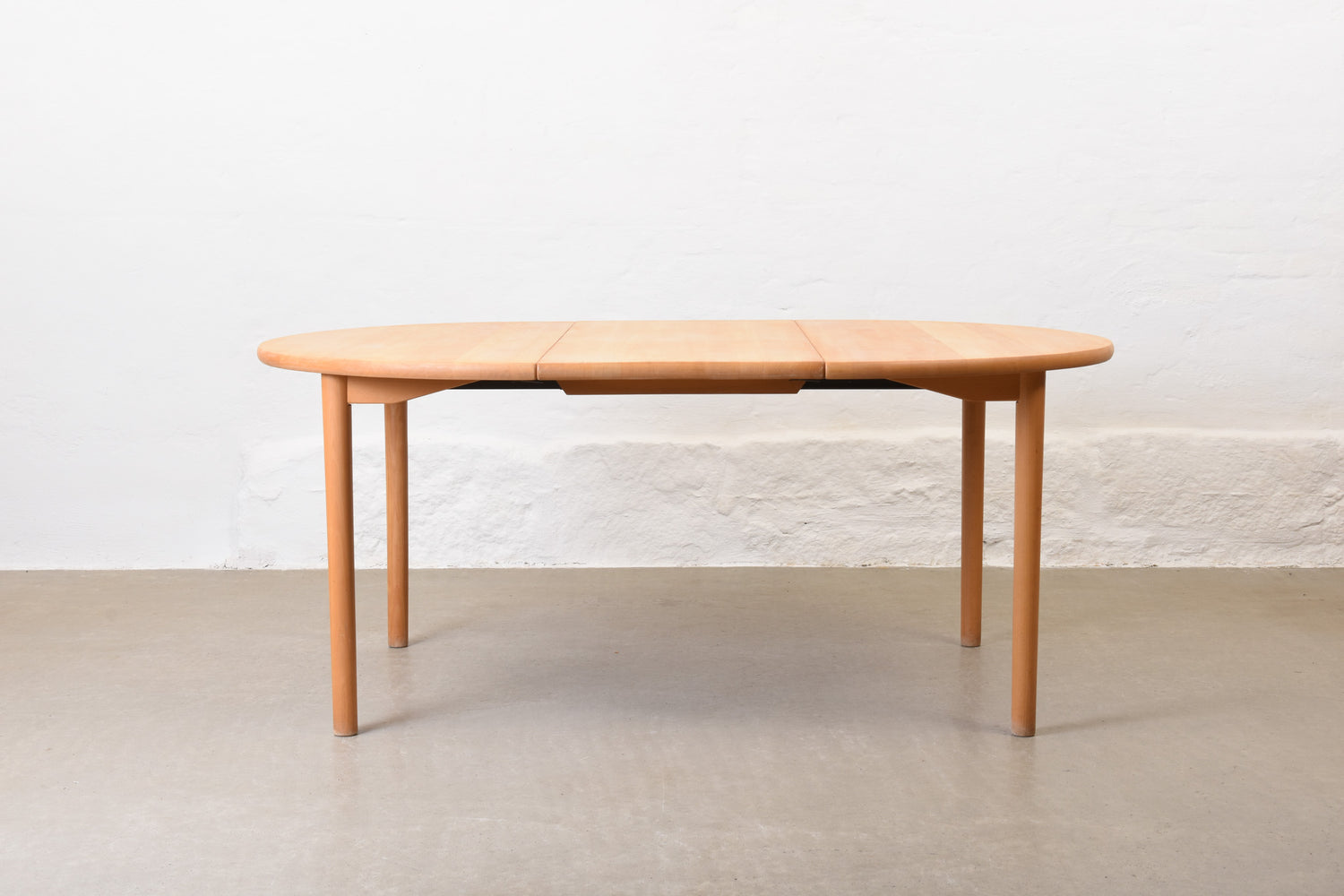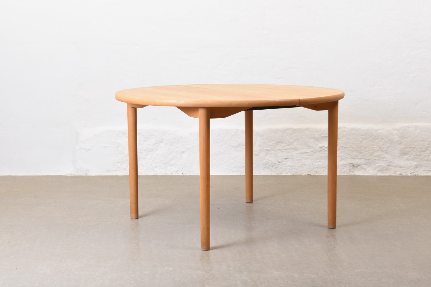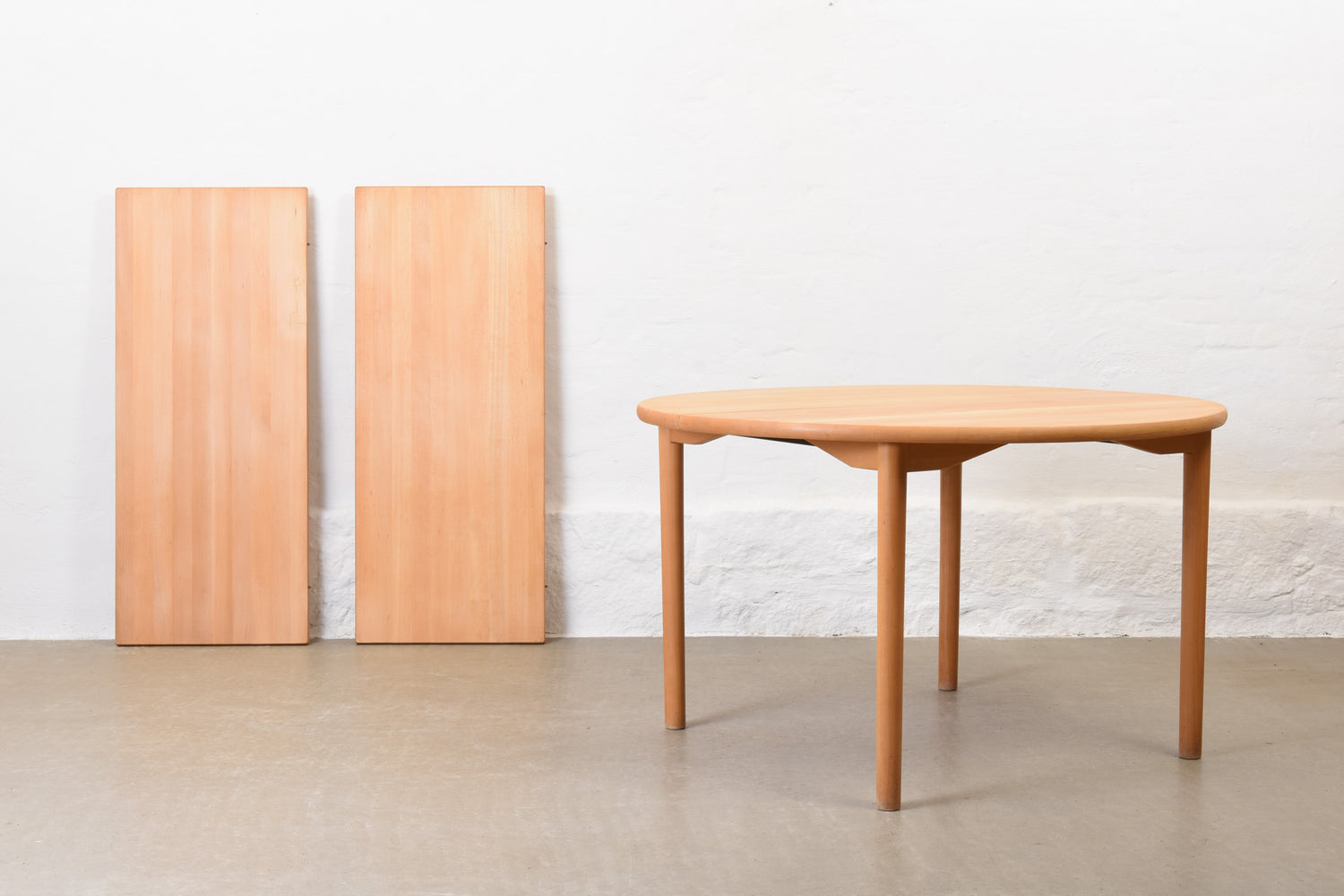 Round dining table in solid beech with two drop-in extension leaves. Sits four normally and up to eight comfortably when fully extended.