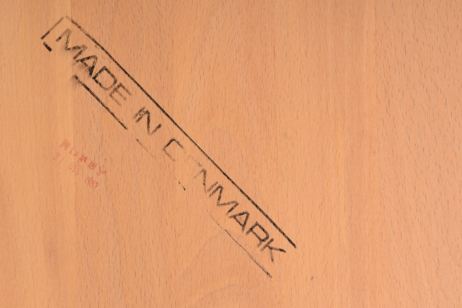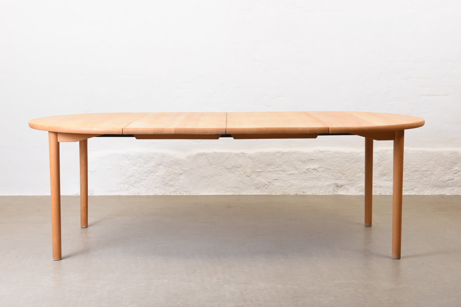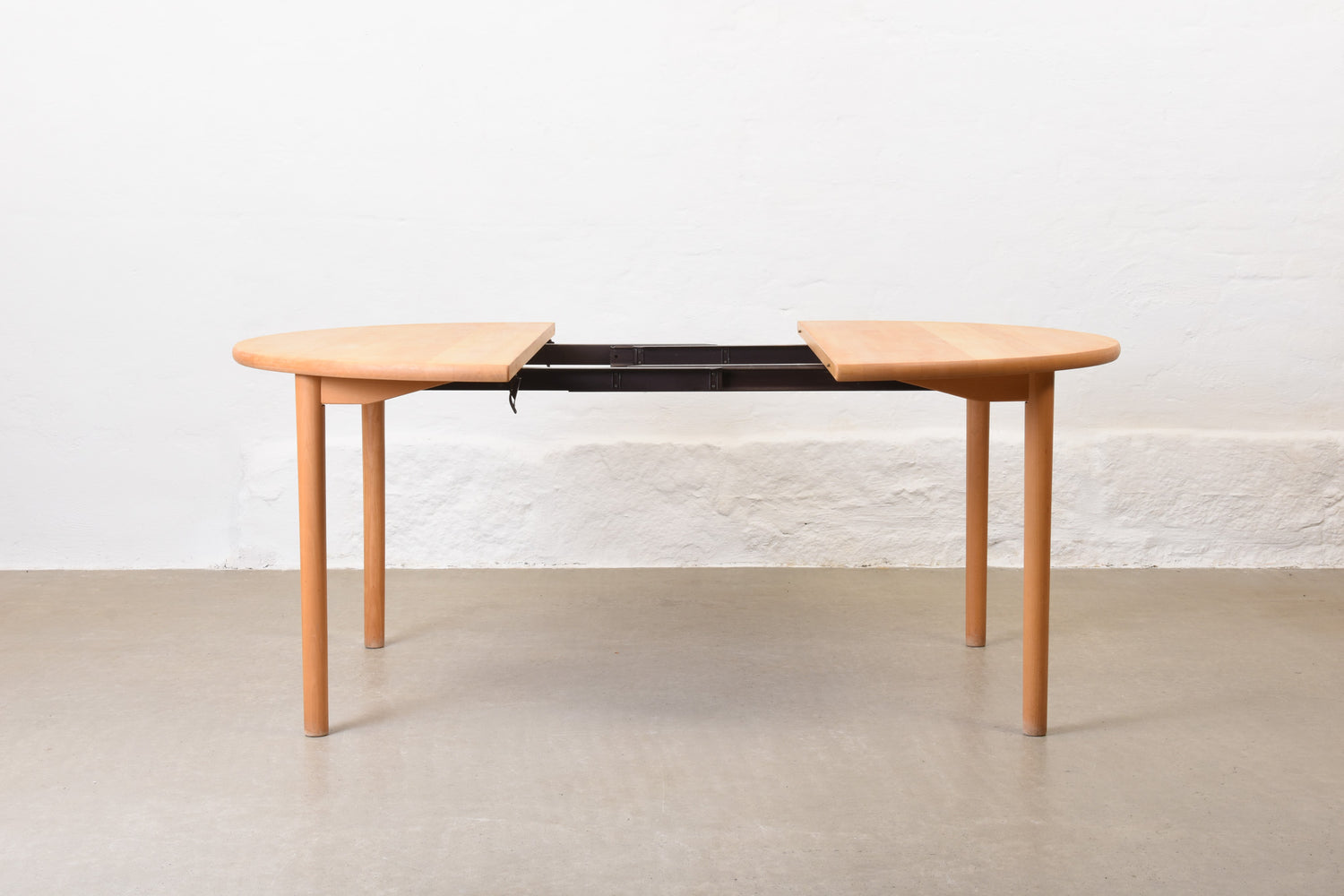 Round dining table in solid beech with two drop-in extension leaves. Sits four normally and up to eight comfortably when fully extended.