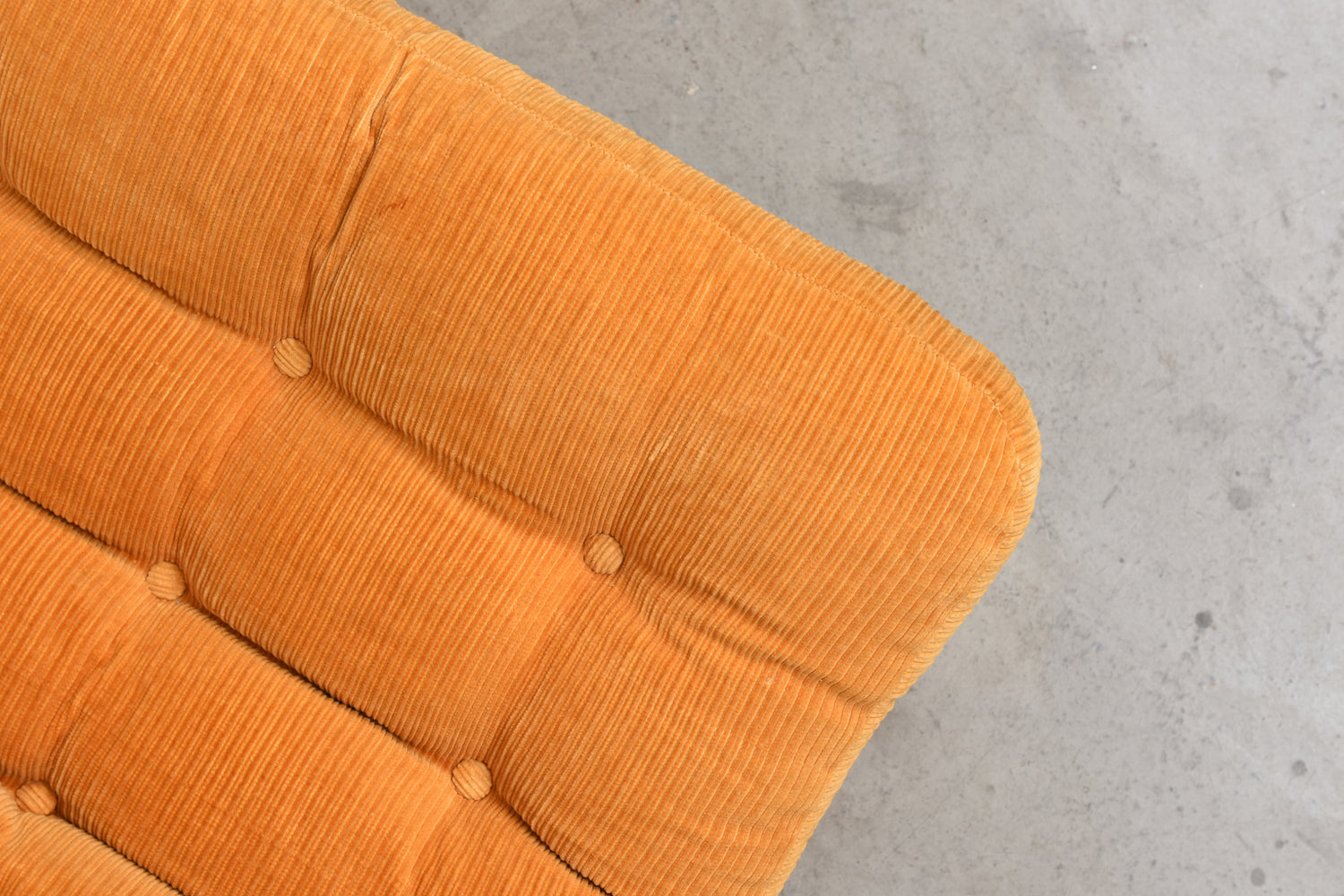 Vintage low back lounger with a beech frame, slung canvas liner and padded cushion with corduroy upholstery.