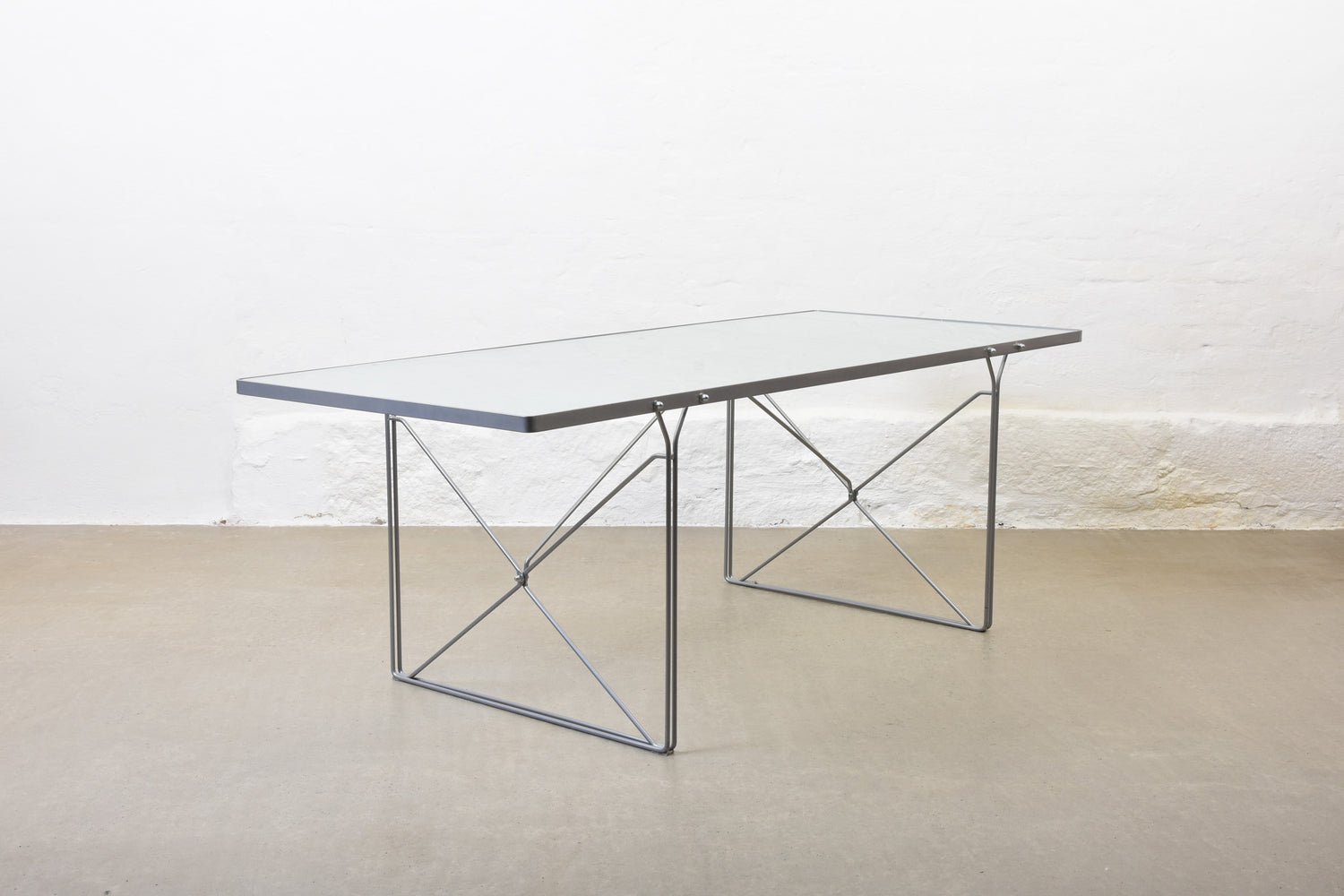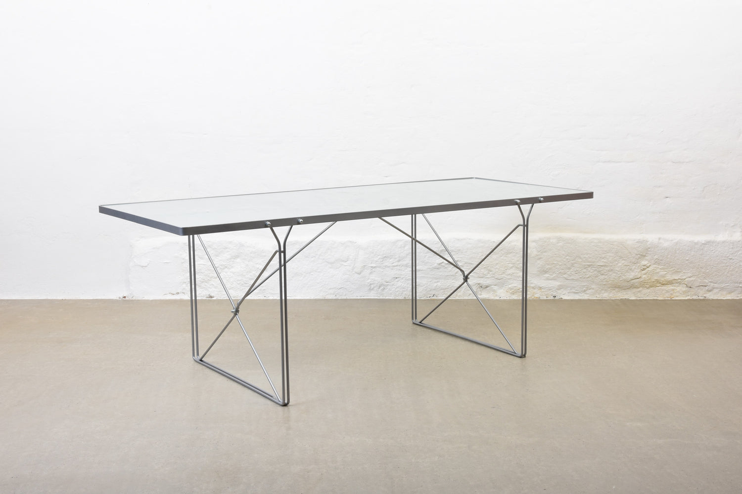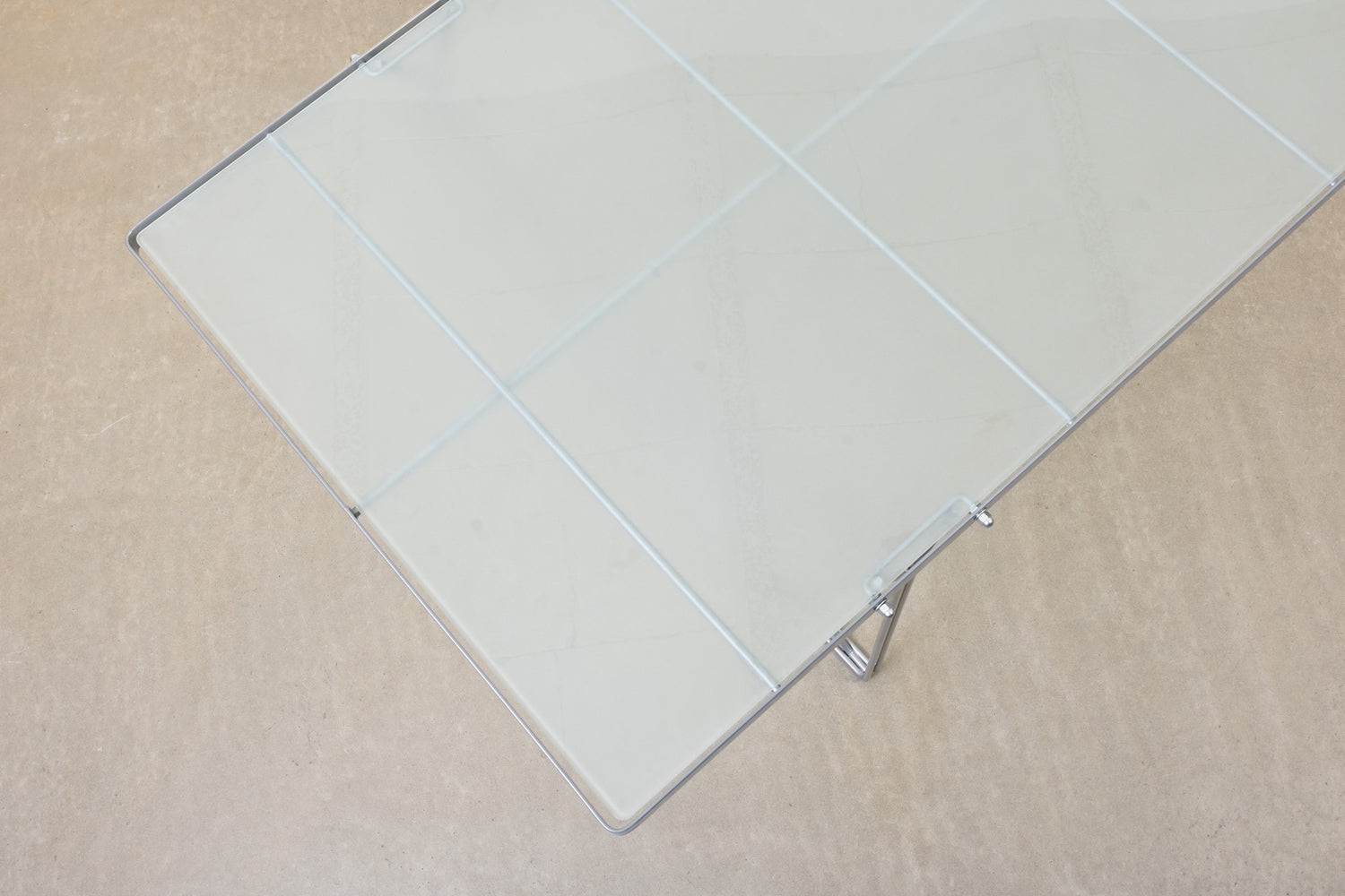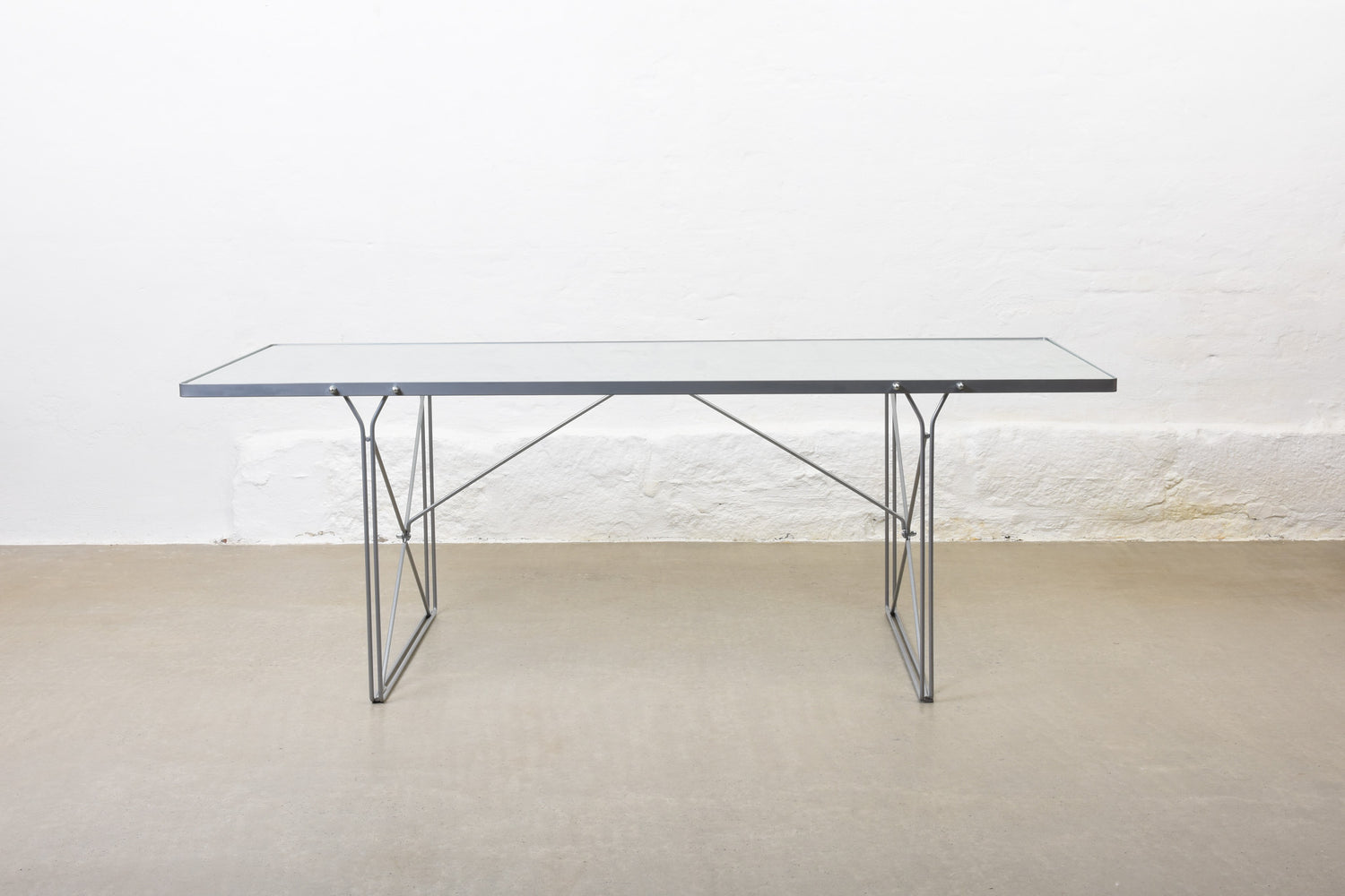 Vintage 'Moment' dining table with a lacquered grey metal frame and frosted glass surface. Sits six to eight comfortably.