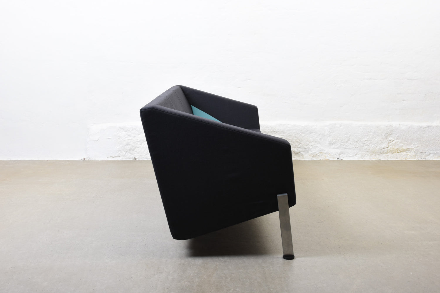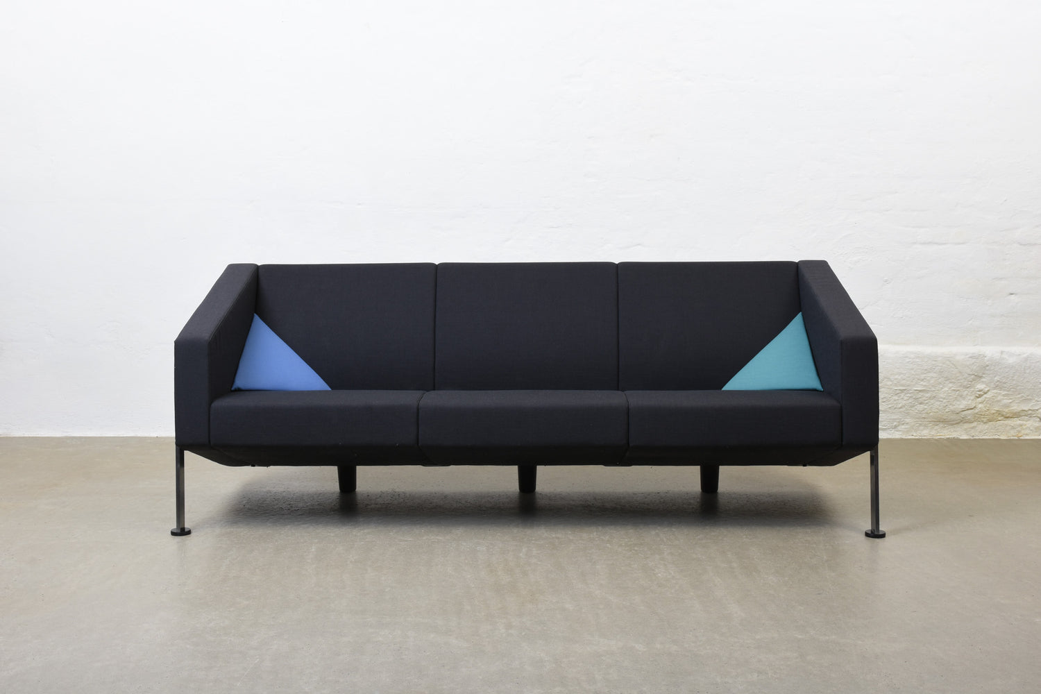 Features contrasting (and removable) triangular corner cushions and sits on a combination of brushed steel and cylindrical synthetic legs.