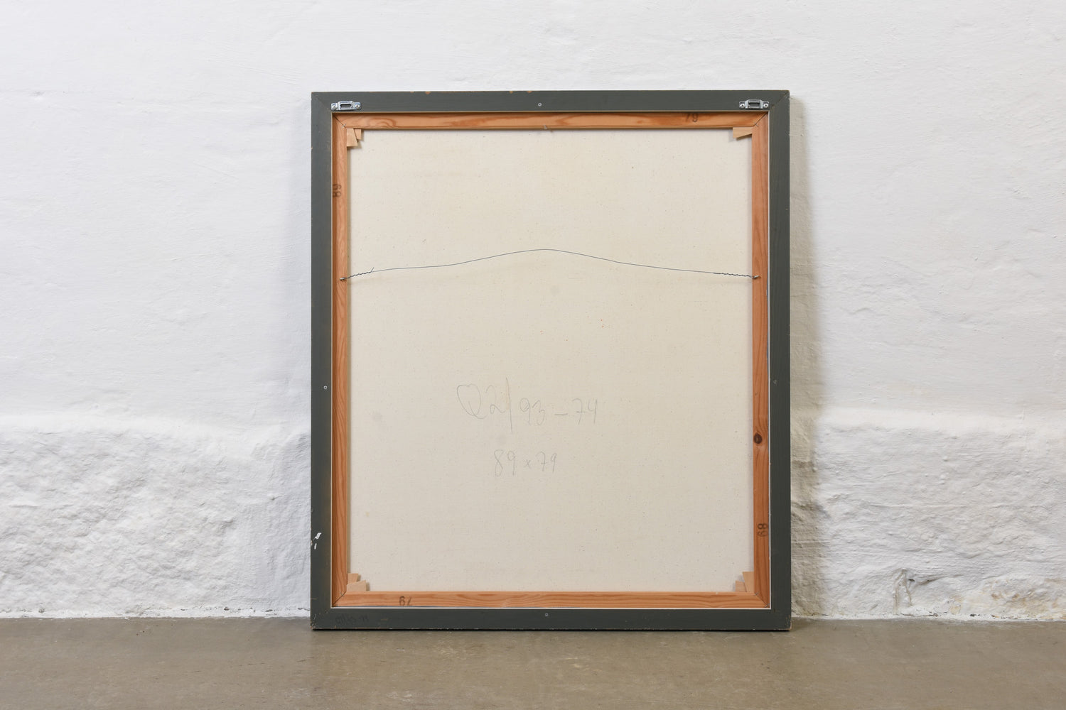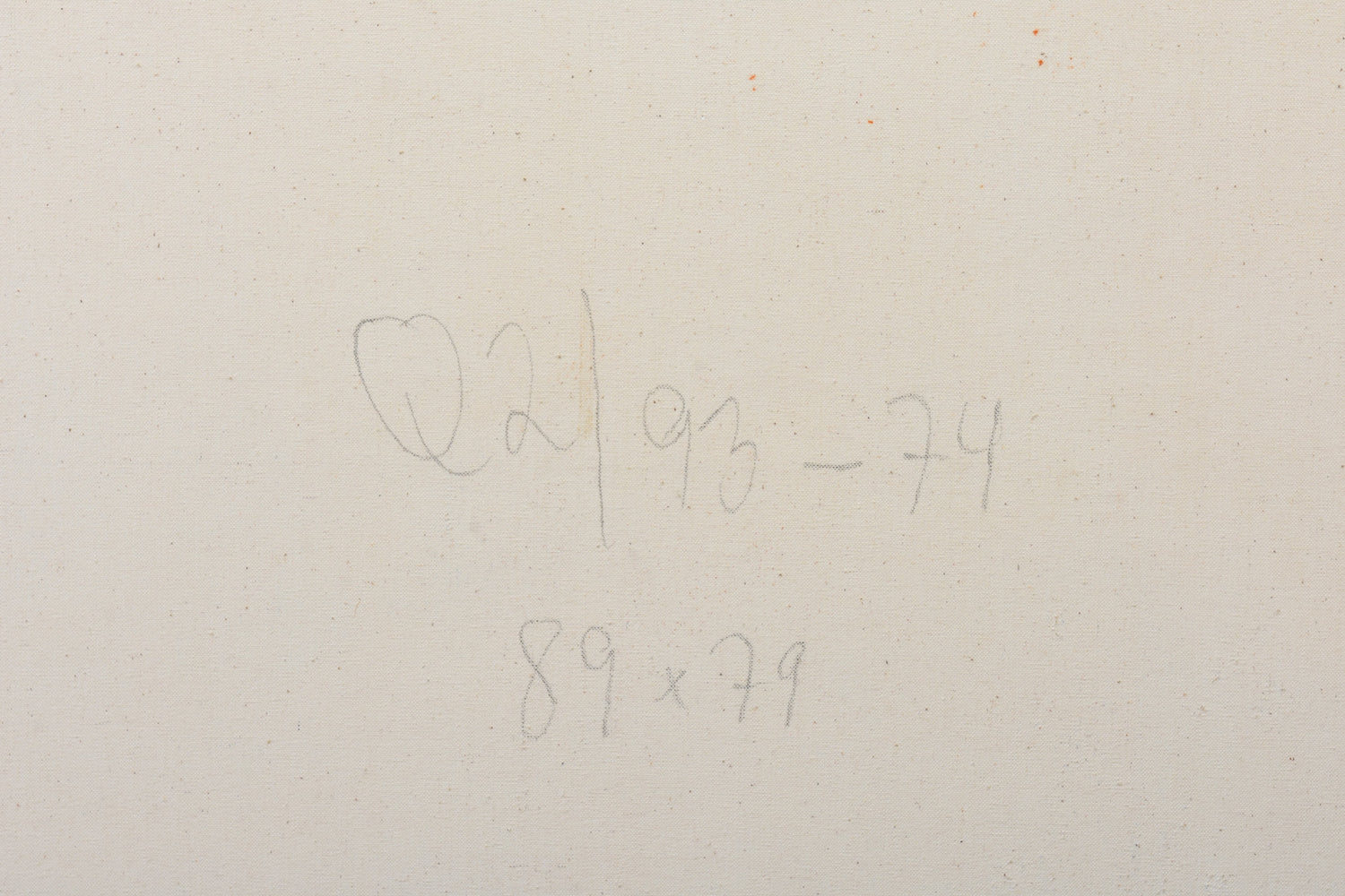 In this painting, the artist’s love of colour and texture is clear. Pigment-rich paint is built carefully in layers and feathered brushstrokes at the edge of the shapes combine seamlessly to create a tactile and glowing oil on canvas. The radiant and luminous qualities of the painting are emphasised through the subtle variations of matte and gloss that stretch over the entire surface of the canvas, inviting us closer to explore more.