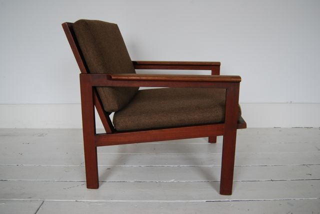 Designed in 1961 by Illum WikkelsíŸ and produced by N. Eilersen, this is the Capella lounge chair, model no. 4. The frame is made of teak and comes with loose foam cushions that have been newly reupholstered in a light brown wool.