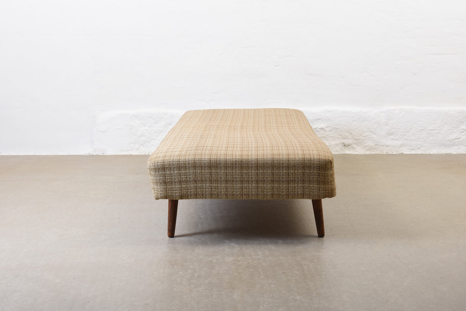 Sprung day bed upholstered in its original wool. Sits on turned stained oak legs.