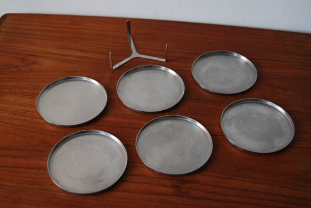 Six piece stainless steel coaster set by Arne Jacobsen for Stelton's Cylinda line.