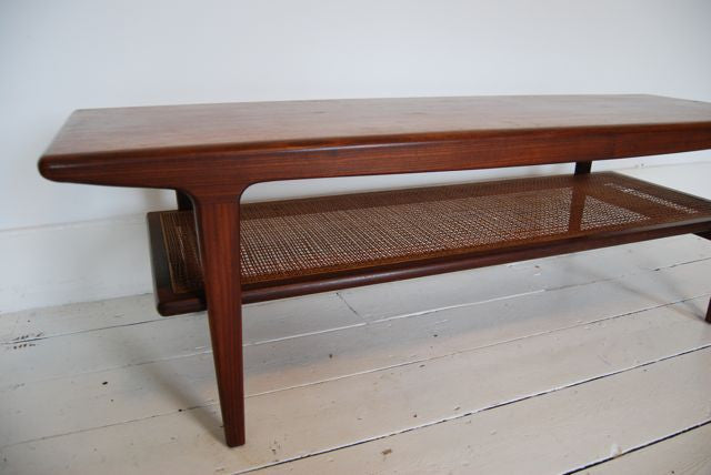 Unattributed two-tiered coffee table of teak wood. Lower shelf of cane. Fine details to the edging of the table.