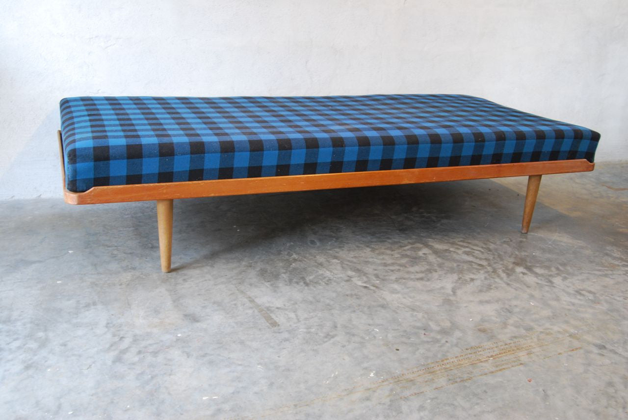 1960s-era daybed featuring an oak frame and a very well-kept and comfortable original mattress.