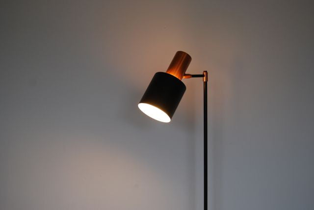 This is the "Studio" lamp by Jo Hammerborg for Fog & Mørup. Constructed of lacquered metal with black and copper detailing. Features a fully adjustable head and produces a warm front and back glow.