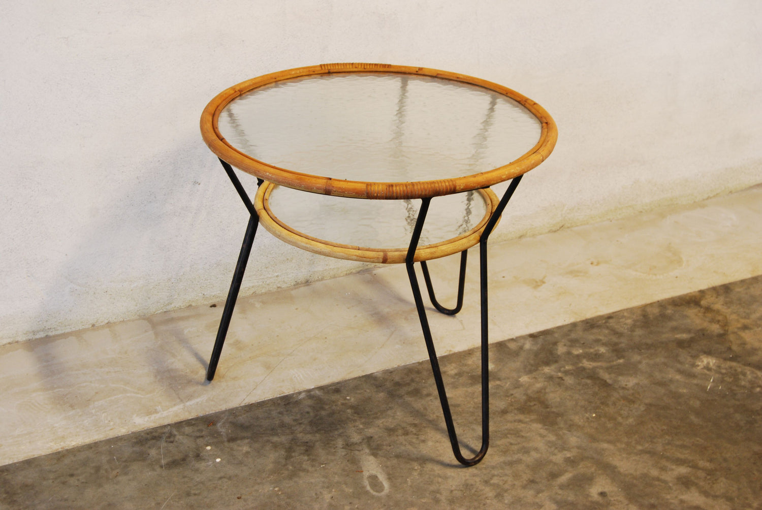 Sweet little two-tiered glass coffee table with a wrought iron base and woven cane detail.