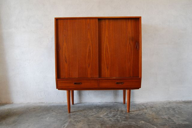 At a glance this looks like your run of the mill Danish highboard storage unit. Upon further inspection you'll see that the previous owner took the time to build themselves a custom sweet little vinyl shelving system. All shelves are adjustable. Denmark, 1960s.