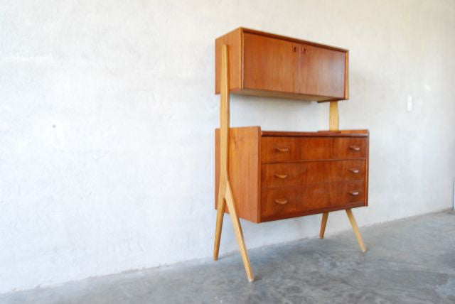 Highboard unit in contrasting teak and oak. Features a pull out writing tablet, top storage as well as three additional large drawers at the bottom. A great city apartment storage solution. Denmark, 1960s.