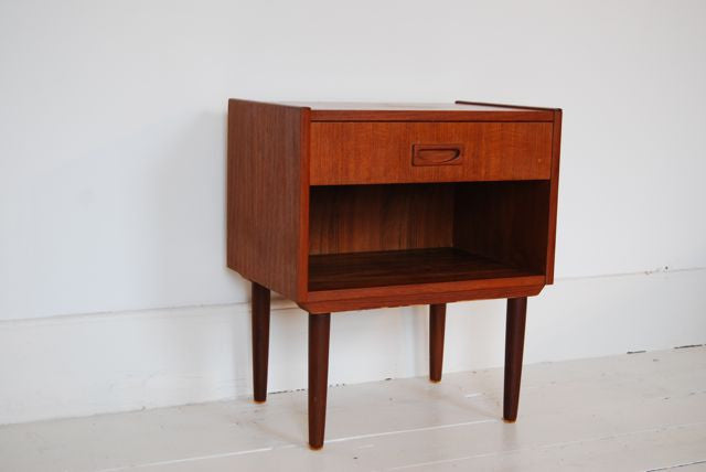 A lonely but lovely bedside table in teak. Has one pull out drawer as well as an additional storage compartment.
