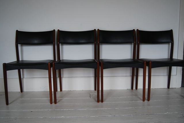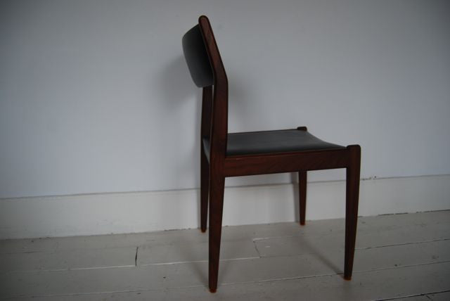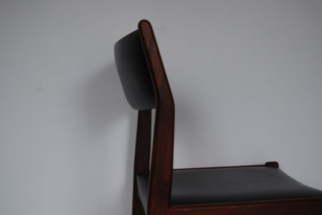 Teak-framed dining chairs upholstered in a black vinyl. Simple and elegant. Produced in Denmark in the 1960s. Three available.