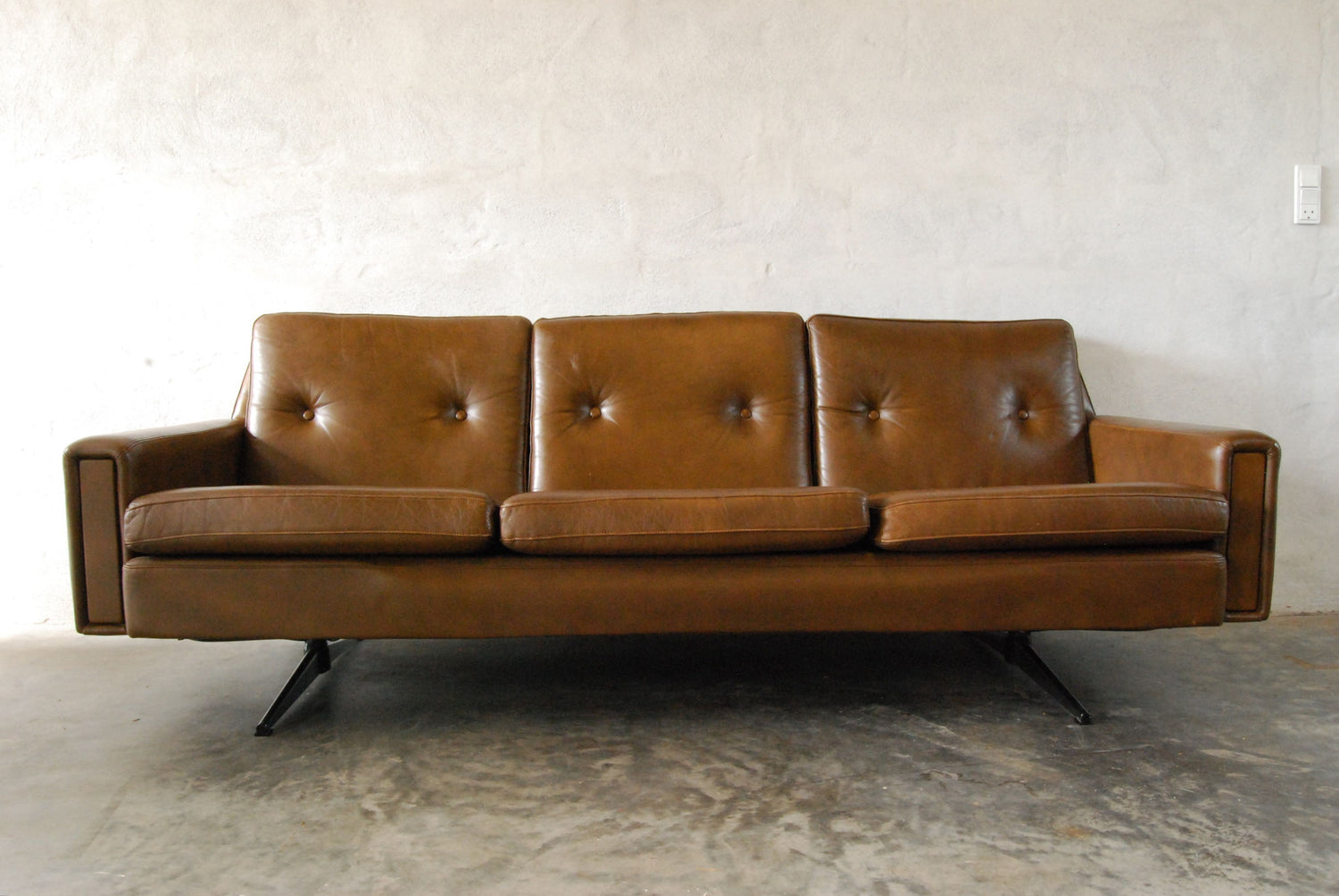 Three seat sofa upholstered in a nougat-coloured leather. Sits on chrome T legs.
