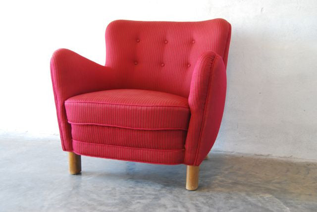 A beautiful lounge chair featuring cherry red upholstery and beech legs. This piece has a very lovely organic shape. A good candidate for reupholstery although it's also fine the way it is. Denmark, 1950s.