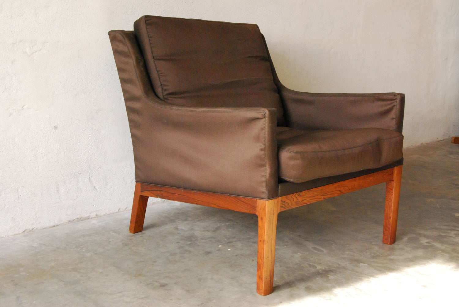 Sleek lounge chair with rosewood legs by Kai Lyngfeldt Larsen for Síëí_ren Willasden. Currently upholstered in brown taffeta with down filled cushions, this chair is in the pipeline to be reupholstered. The price below is for the item "as is."