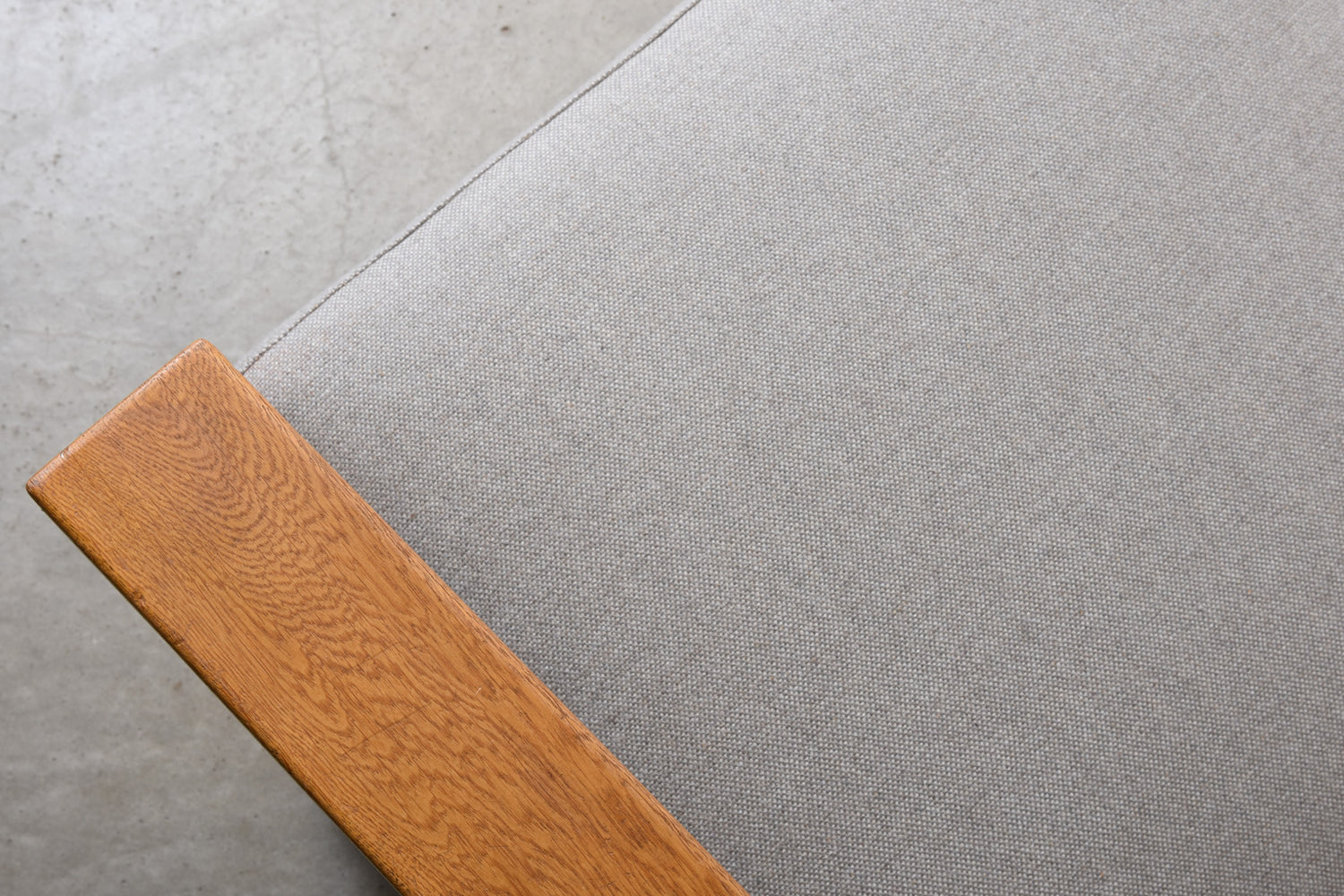 Low back two seat sofa with a solid oak frame, four loose foam-filled cushions newly reupholstered in lead grey wool and brand new elastic webbing.