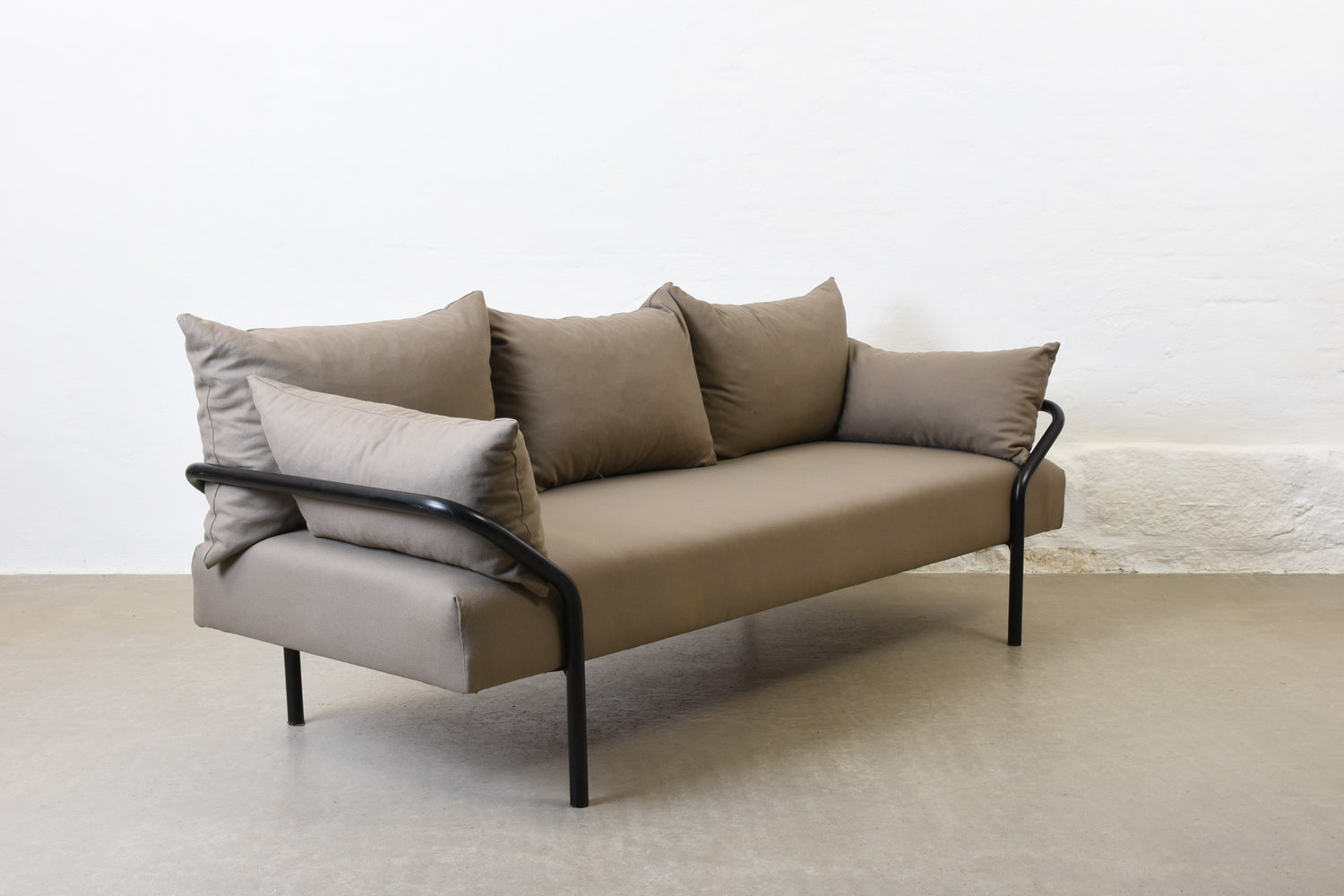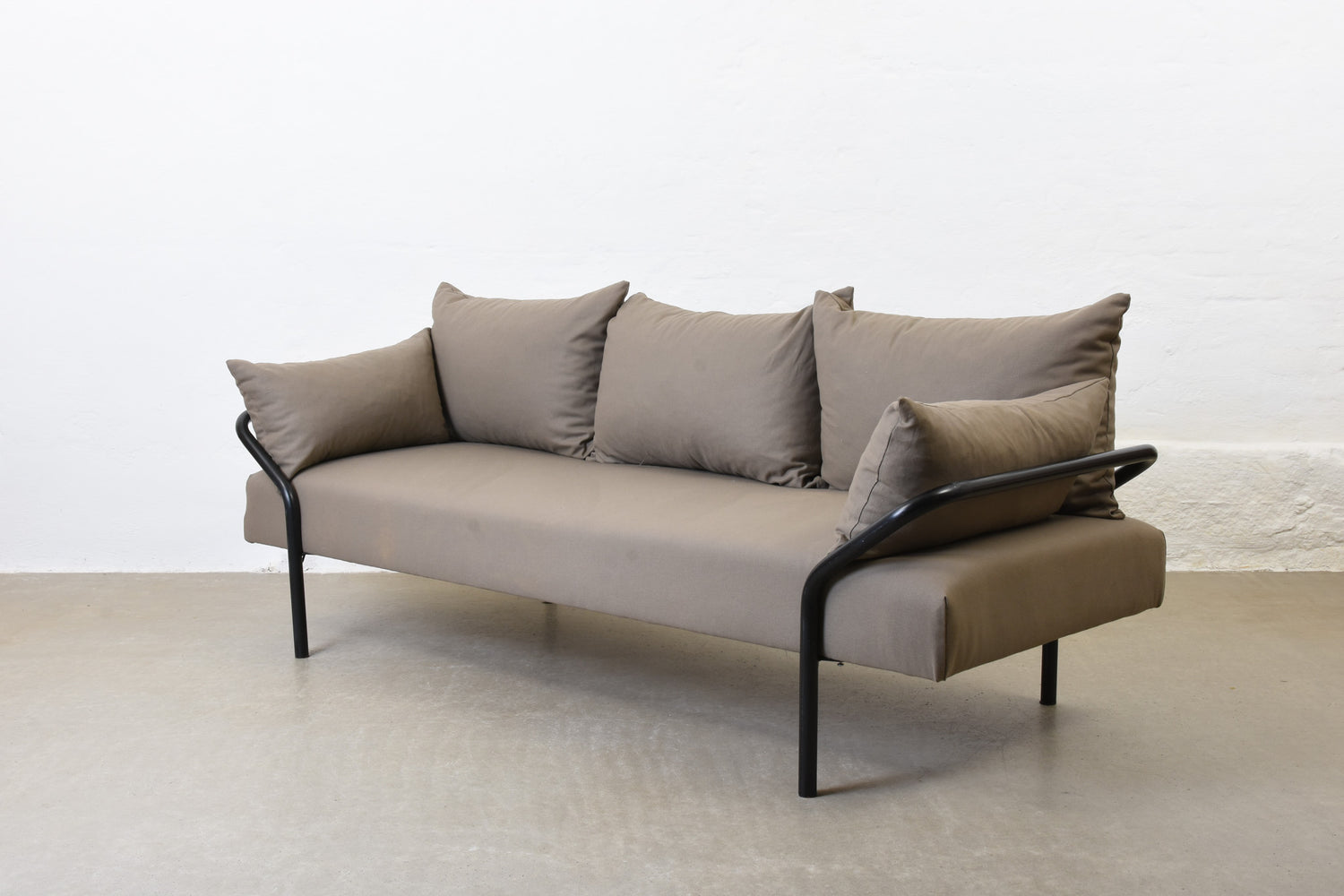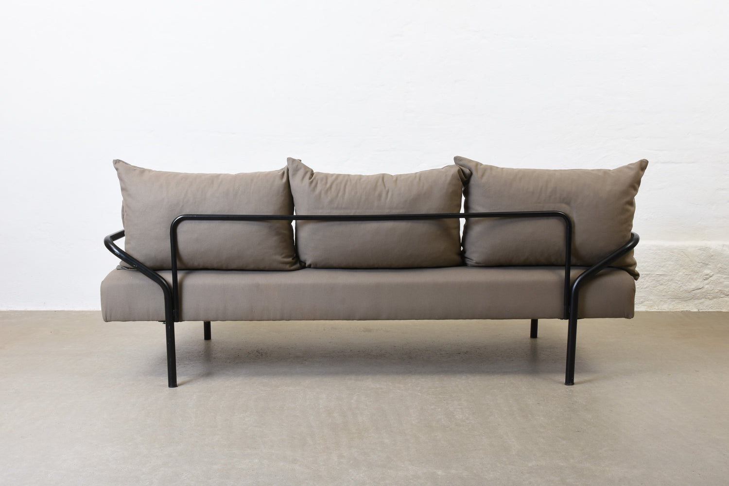 Vintage day bed with a matt black lacquered tubular steel frame, sprung mattress and five loose cushions newly reupholstered in grey cotton canvas.