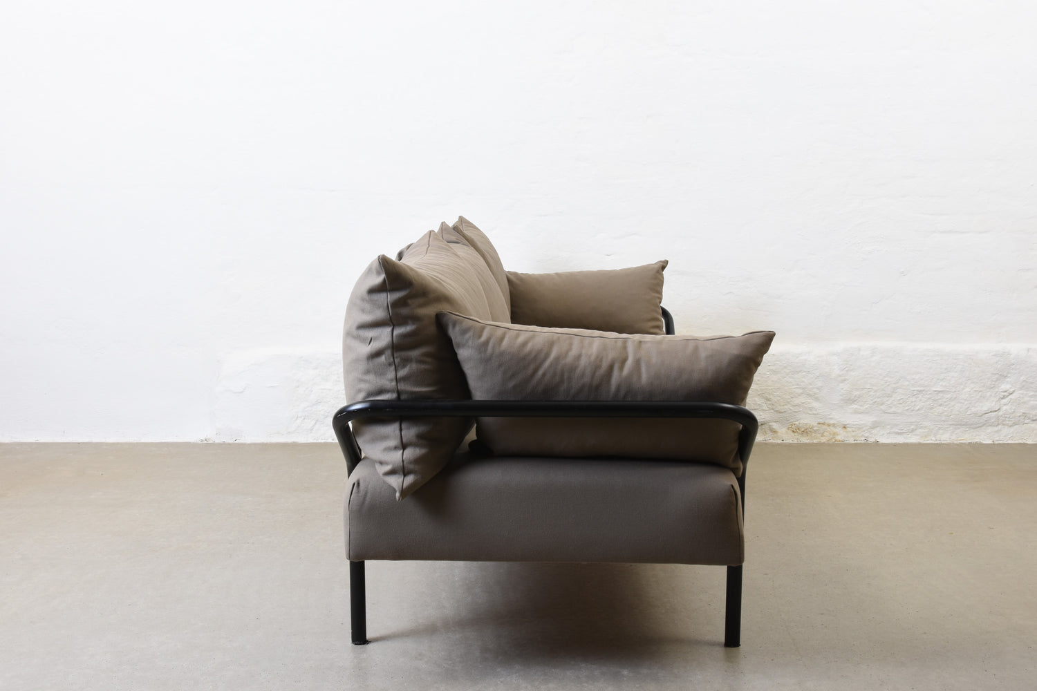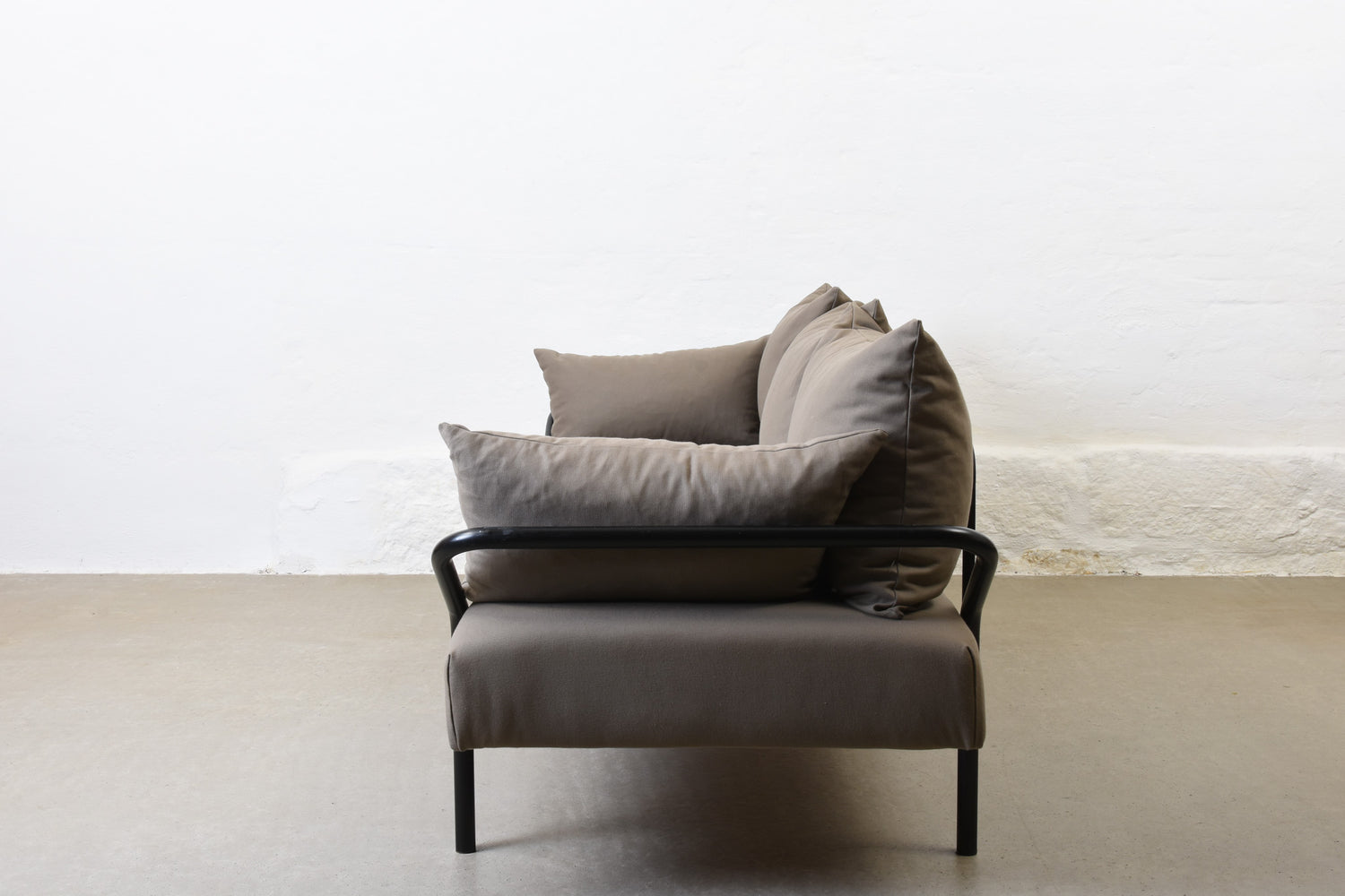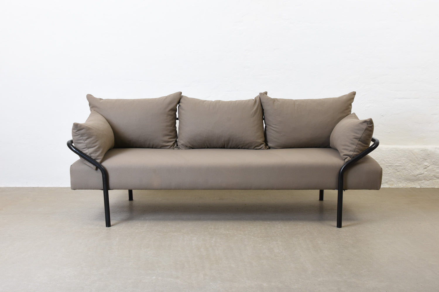Vintage day bed with a matt black lacquered tubular steel frame, sprung mattress and five loose cushions newly reupholstered in grey cotton canvas.