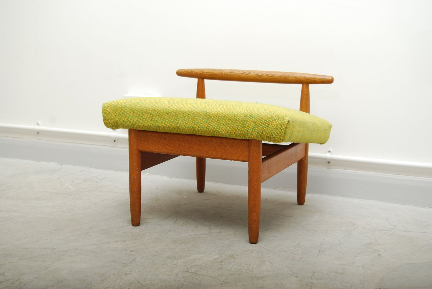 Oak foot stool newly recovered in Bute tweed fabric. Denmark, 1960s.