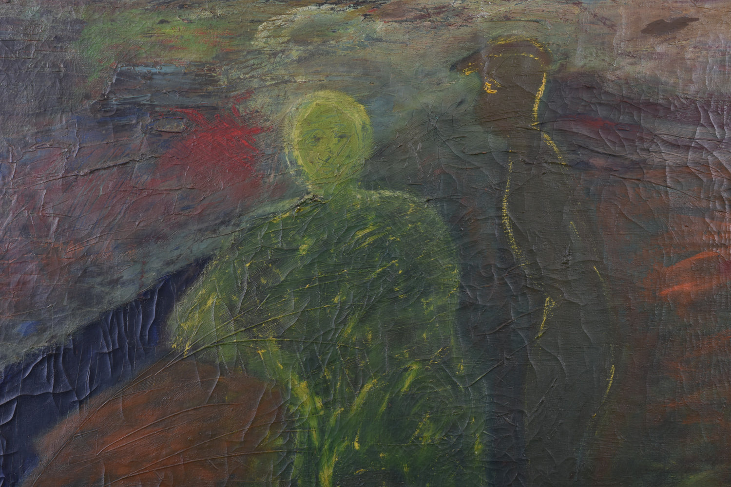 In this oil painting, we observe two figures under a hazy sky of warm, earthy colours that the artist has chosen to represent in a non-naturalistic colour palette. Heavy with atmosphere, this dream-like scene invites us to explore how colour can be used as a representation of emotions and ideas.