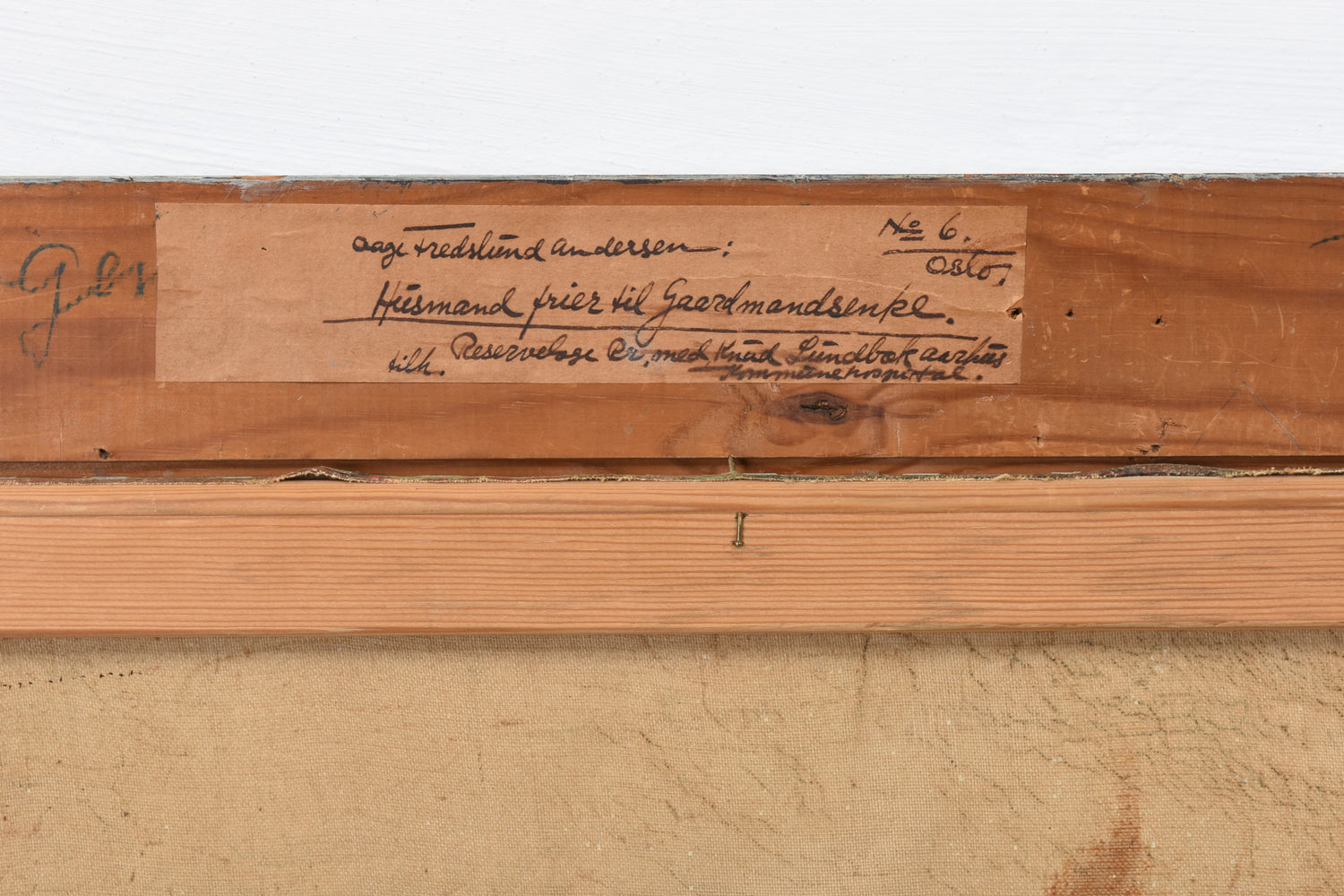 The text on the reverse of the painting reads, 'Farmer proposes to Geerdman’s widow, commissioned by Knud Lundbæk for Aarhus Kommune Hospital.’ Although this description offers us some insight into the two figures, the ambiguous nature of this painting leaves the scene open to interpretation, allowing our imagination to build on the narrative.