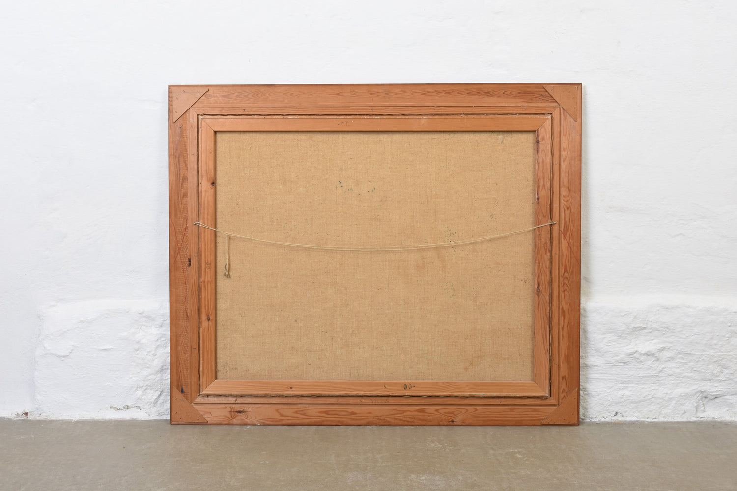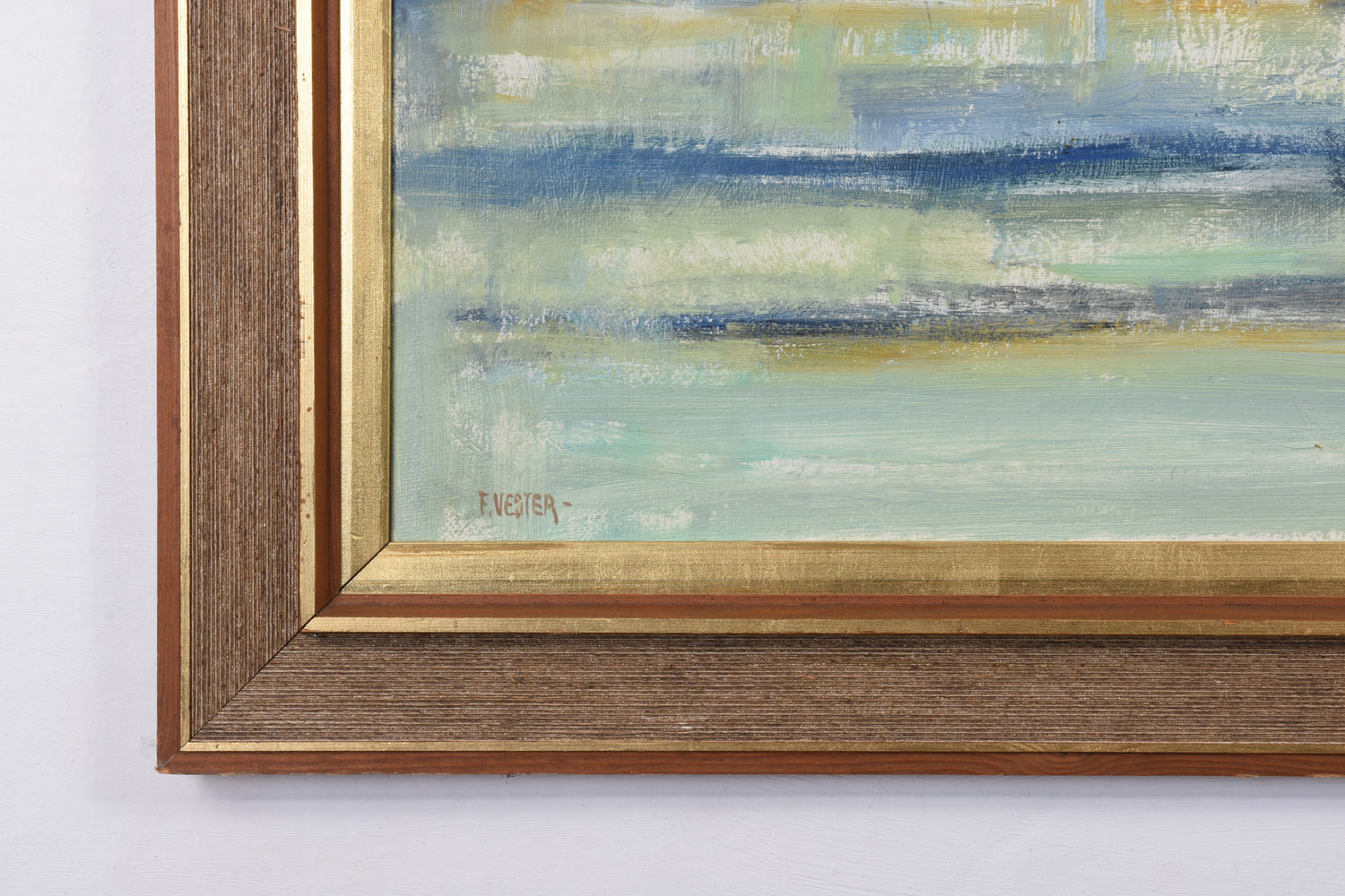 Frans Vester Pedersen (1934-1972) is a Danish Postwar artist. Throughout his body of work, his paintings typically involved rural landscape scenes, often depicting fields that merged into abstract, hazy horizons. So a distinguishing quality about this particular piece is his change in subject matter, shifting to explore human-made structures. The choice of cooler, pale turquoise tones also represent a departure from the earthy colour palette of his other works.