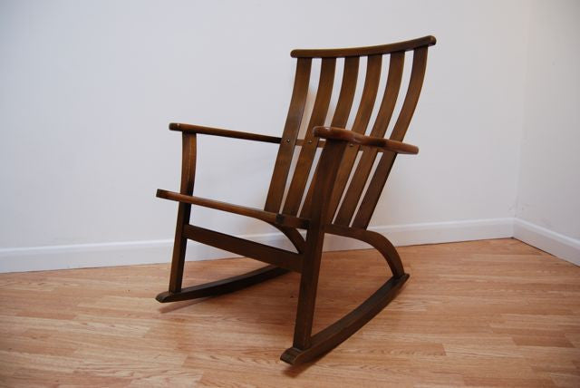 Note: One available. Stunning pair of slatted-back rocking chairs in smoked beech. Denmark, 1960s.