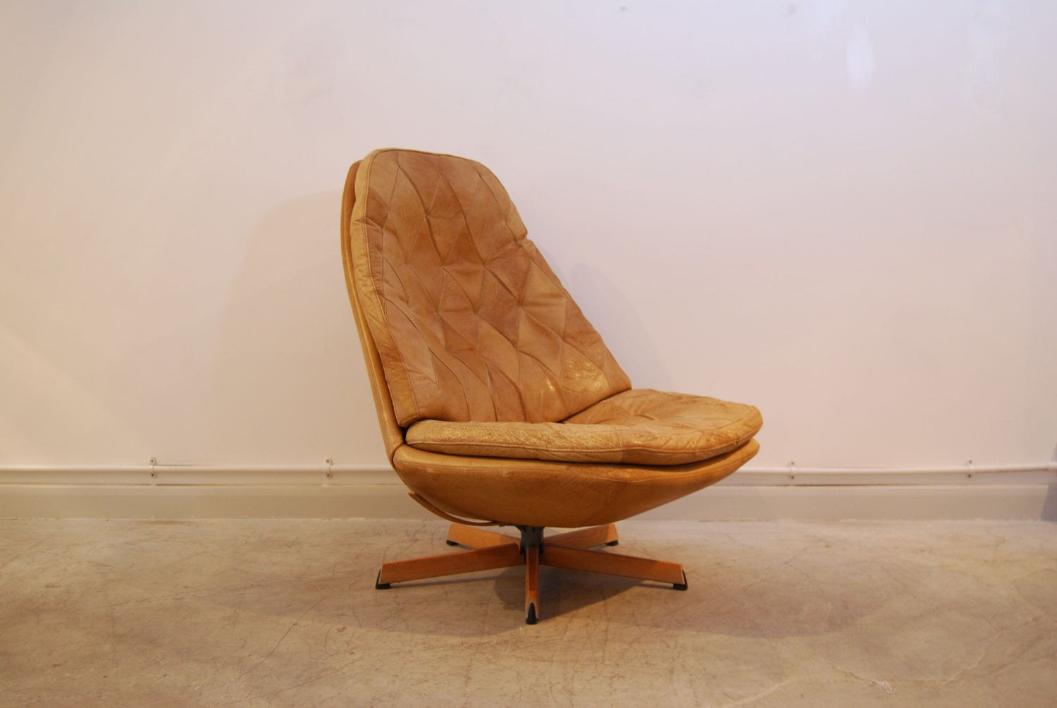 A pair of reclining lounge chairs by Madsen & Schubell. Upholstered in tan leather with latex foam cushions. Features oak base. Denmark, 1960s. Note: Chairs can be purchased individually.