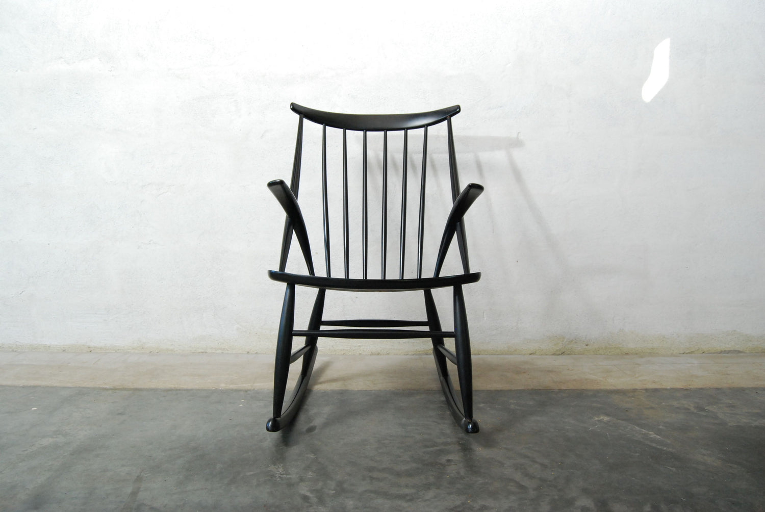 An ebonised beech rocking chair by Illum Wikkels for N. Eilersen. Perfect condition. Produced in Denmark in the 1950s.