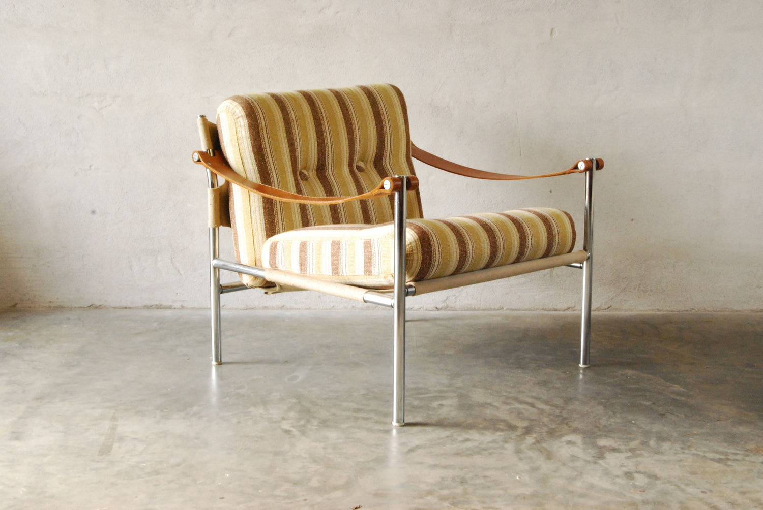Very cute and comfortable safari chair. Wool upholstered foam cushions on a tubular steel and canvas base. Flat packs for easy shipping/storage.