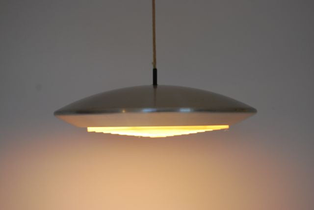 Brushed chrome ceiling lamp with off-white diffuser. Uses two bulbs. Information on designer and manfacturer coming soon.