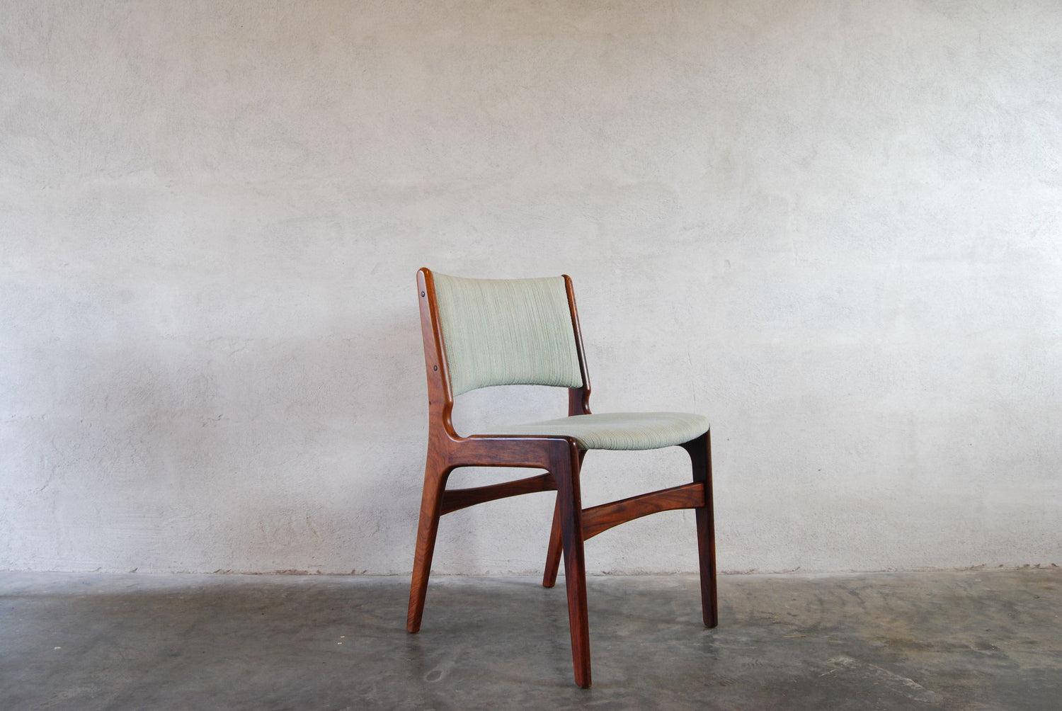 Set of four stunning rosewood dining chairs. Upholstered in their original wool fabric which does show light signs of wear, these chairs are in our pipeline to be reupholstered. Our price is "as is."