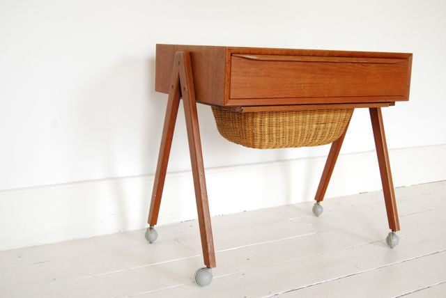Very elegant 1960s teak Danish sewing trolley with splayed legs, removable wicker basket and amazing construction details. Like all of our sewing tables, if sewing isn't your thing these tables are great for storage or as an occasional table.