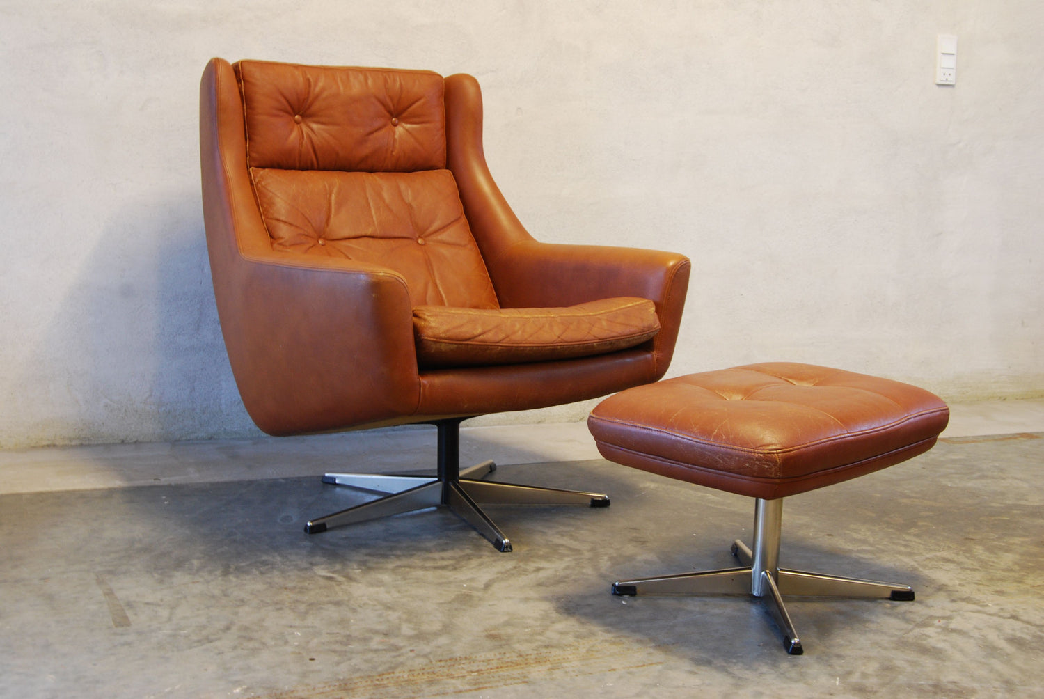 Bucket-style lounge chair in leather. Sits on chrome swivel base and comes with matching footstool. Produced by Lystager Industri in 1973. Two available.