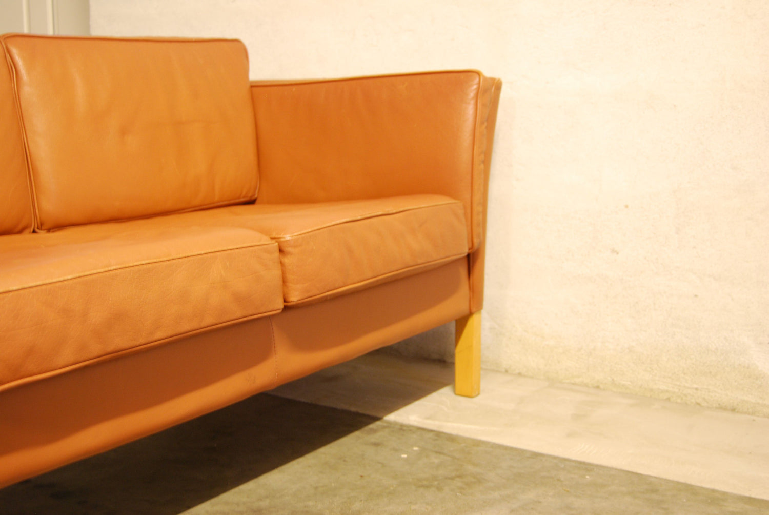 Two seat sofa in a tan shade of leather. In excellent condition. Sits on squared oak legs.
