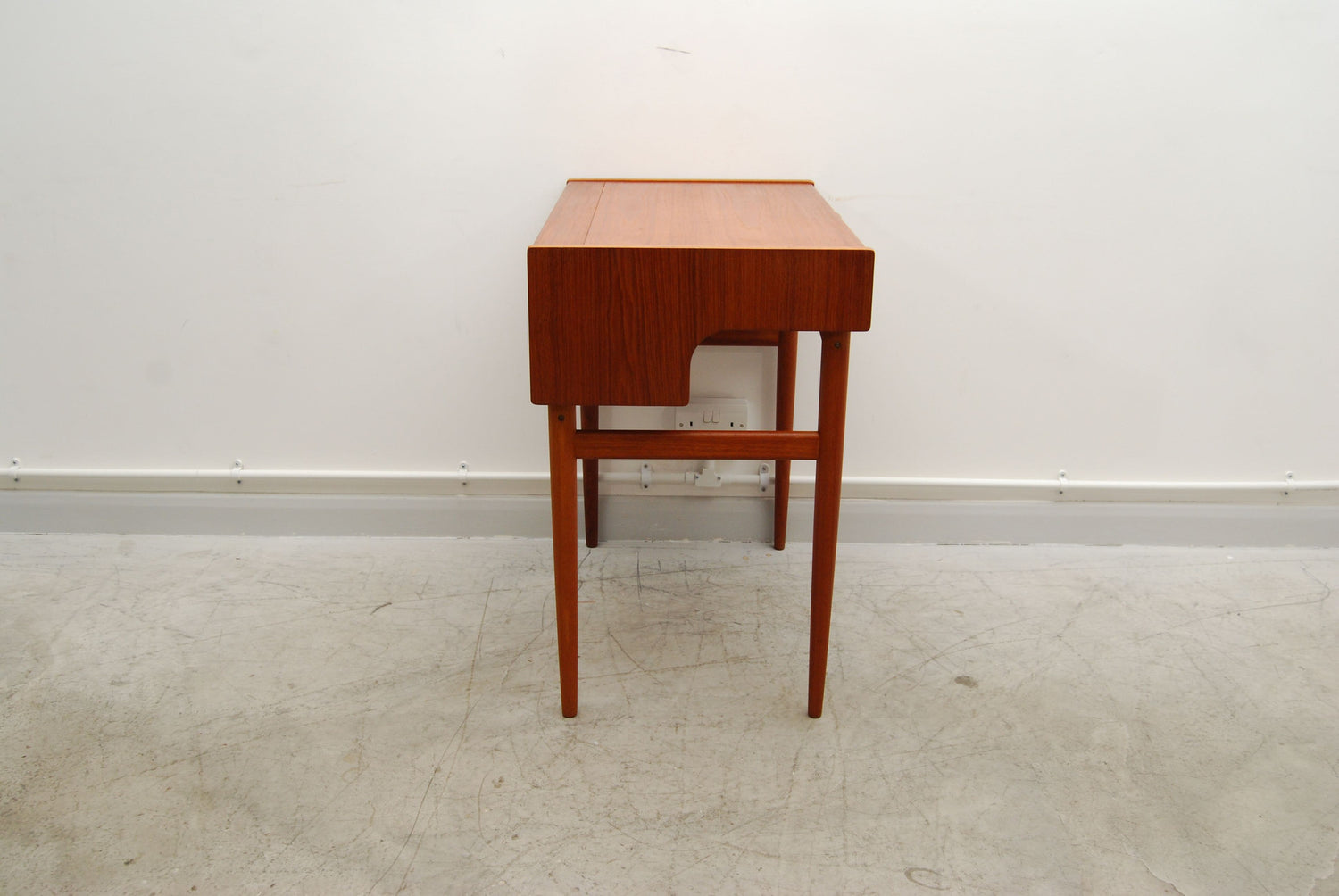 A small desk / beauty table in teak. Features flip-up top for further storage. Denmark, 1960s.