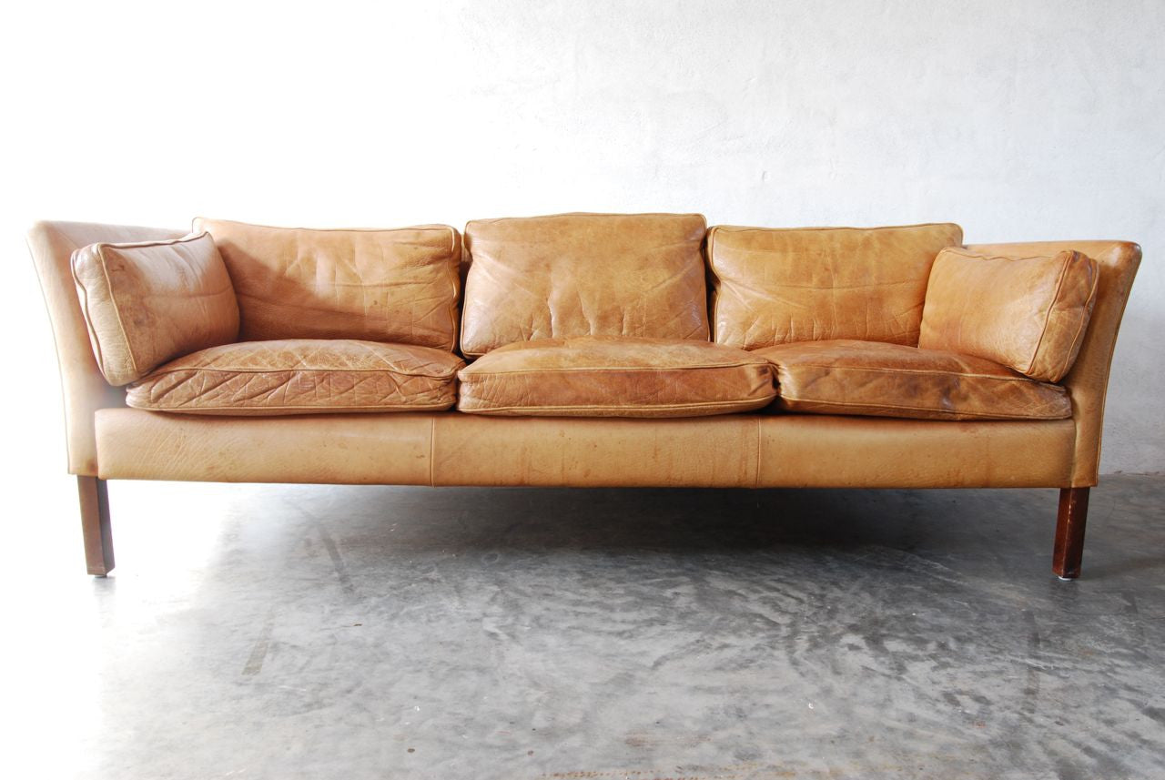 Three seat sofa featuring down-filled, loose cushions and upholstered in beautifully aged buffalo leather. Denmark, 1960s.