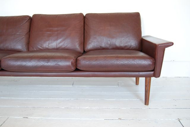 A truly stunning three seat leather sofa in a dark brown. Features winged armrests and solid rosewood legs.