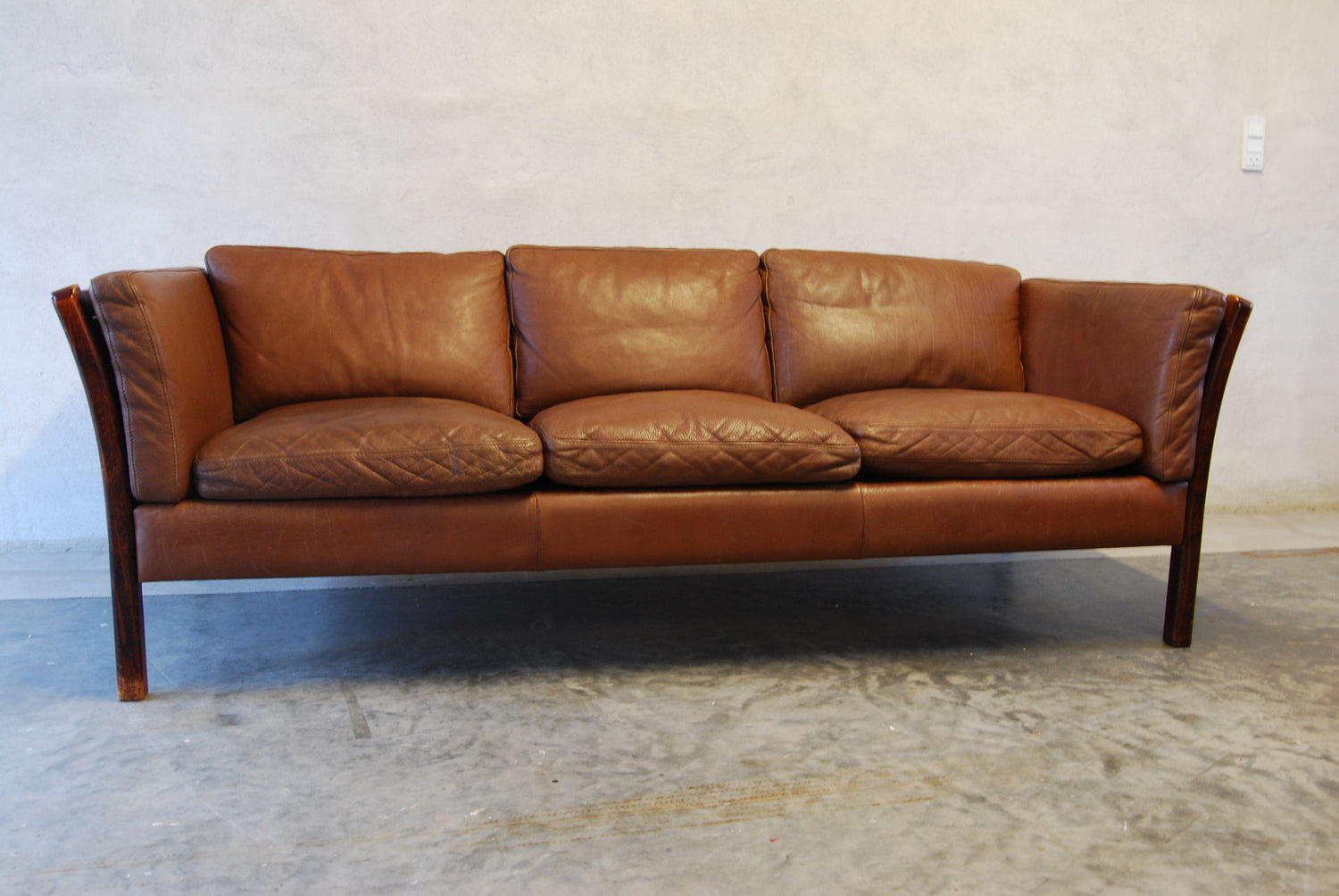 Lovely three seat sofa in leather by Stouby. Features down-filled cushions and stained beech detail to the armrests and legs.