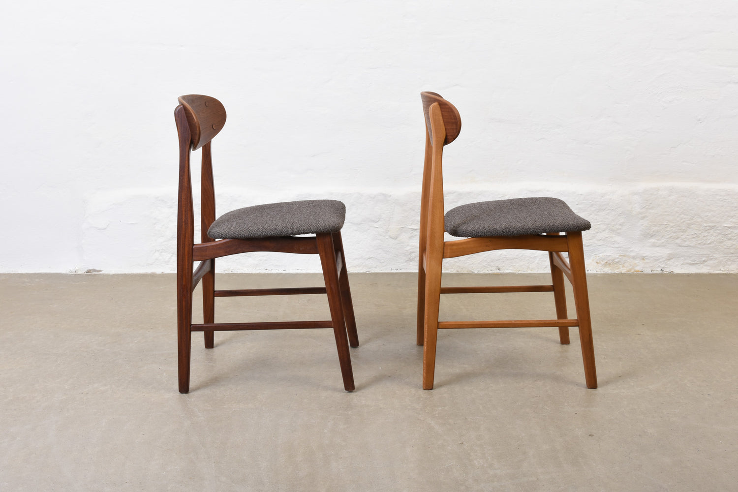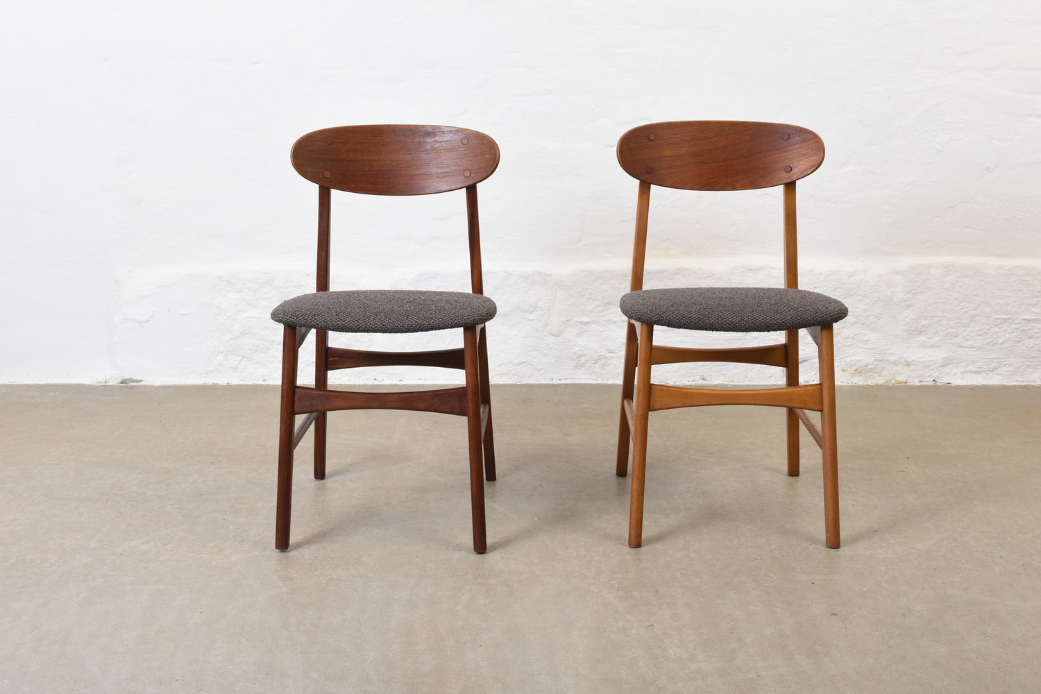 Identical pair of dining chairs with teak backs but different frames. The chair on the left (£195) is made entirely from teak and the chair on the right (£175) has a teak back with a beech frame.