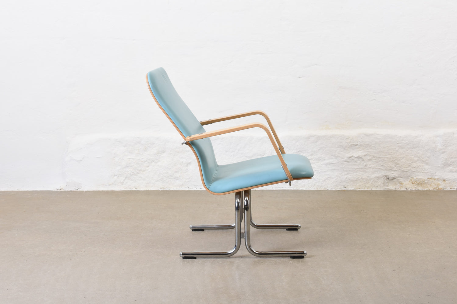 Matching pair of lounge chairs with birch ply backs, armrests and padded seats upholstered in their original leather. Each chair sits on a tubular metal base.
