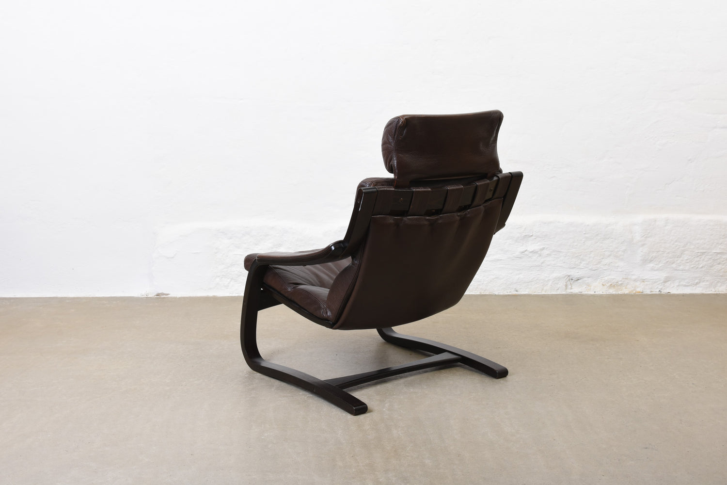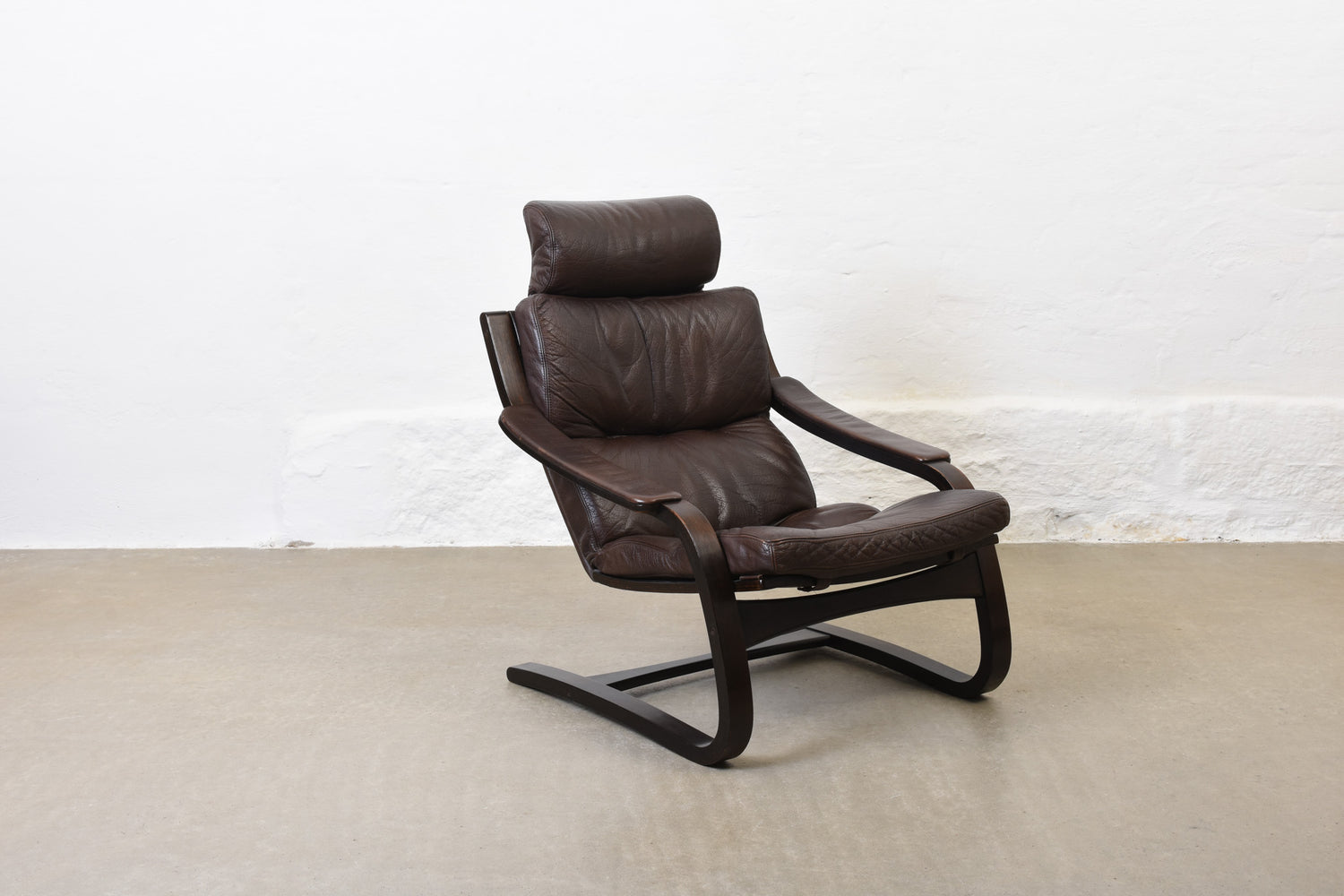 Matching pair of high back 'Kroken' sling chairs with leather pad cushions and stained beech frames.