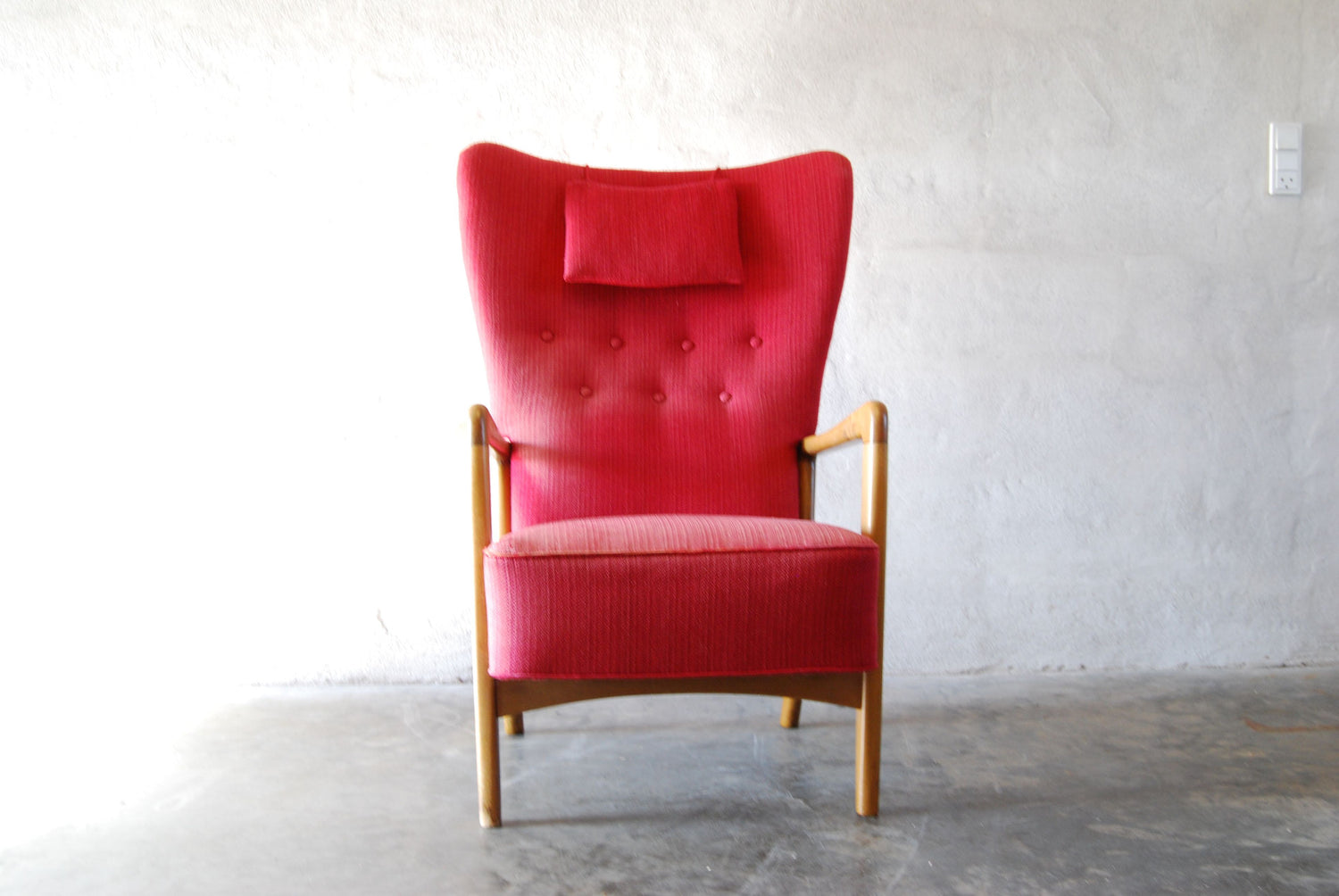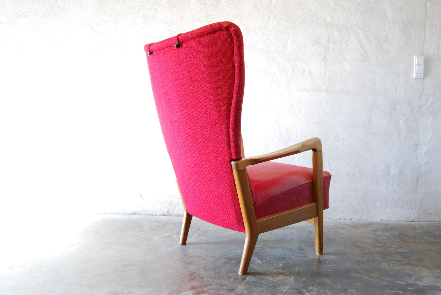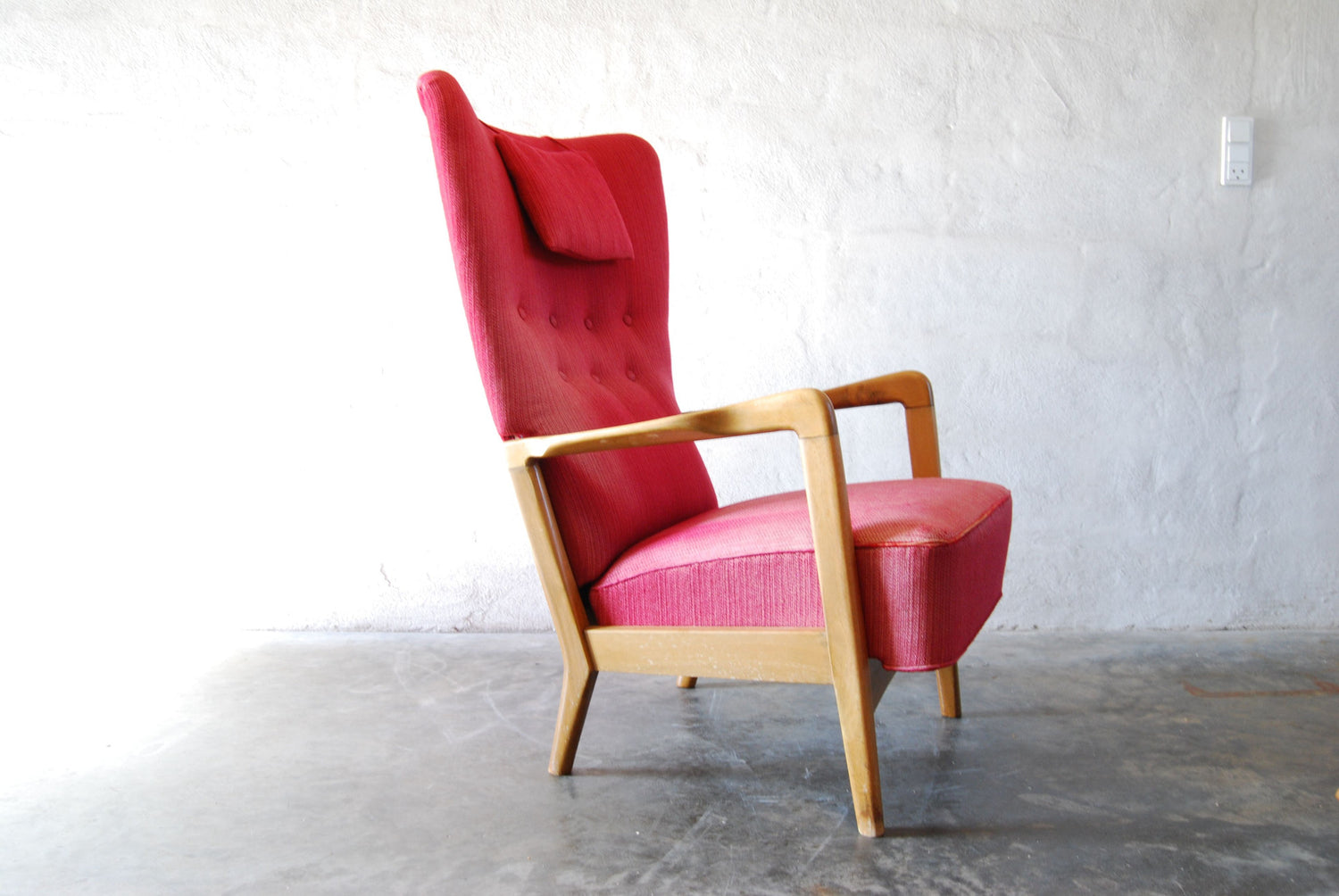Stunning wingback lounge chair in its original red wool fabric (some wear/color fading to seat area). Features beech armrests and legs. Denmark, 1940/50s.