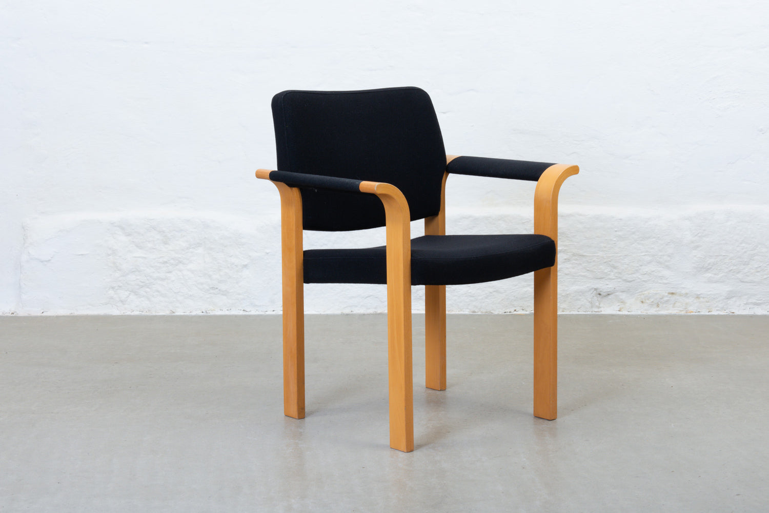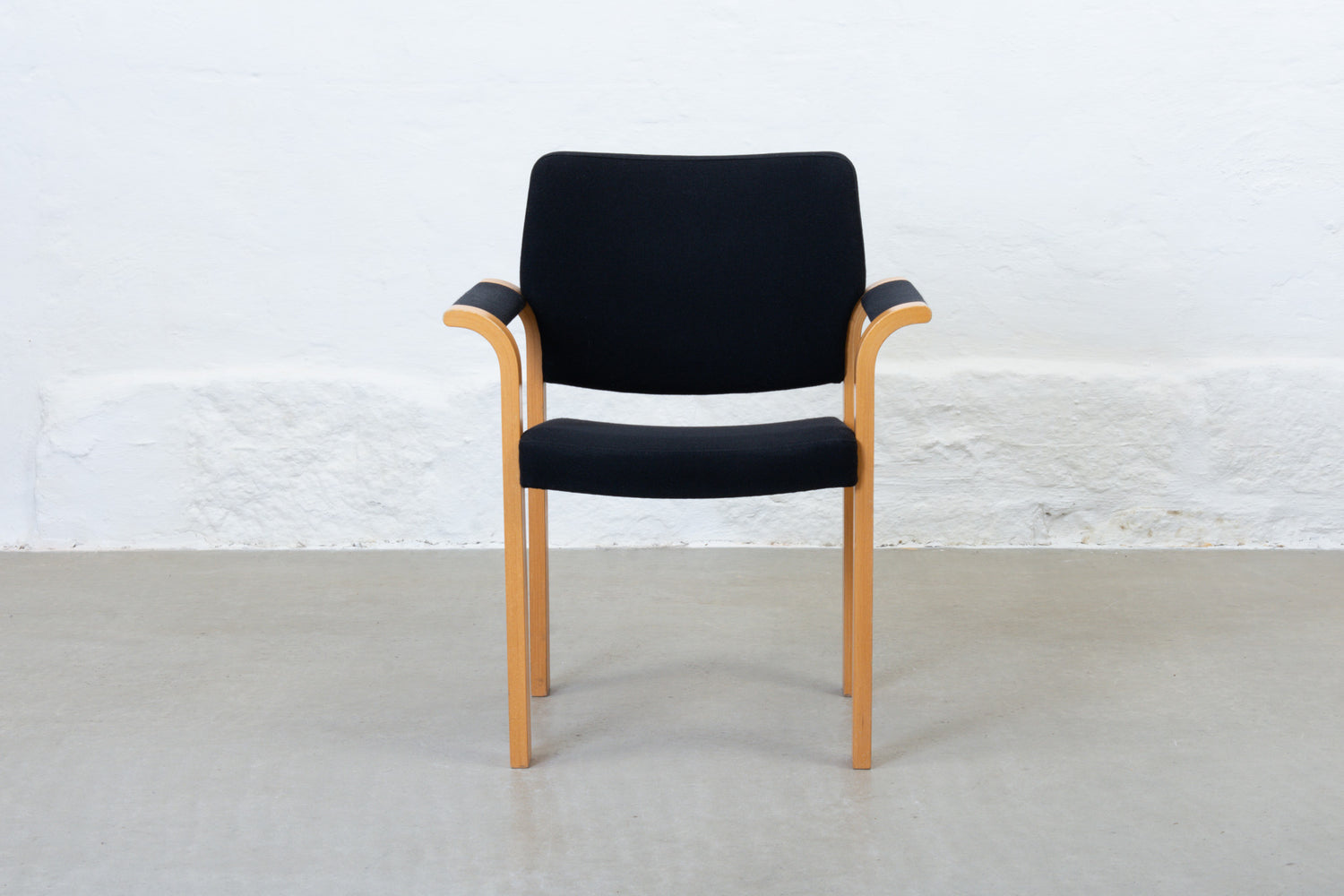 Set of four 'Model 61' stacking armchairs with beech frames and padded seats/backs upholstered in their original black wool.