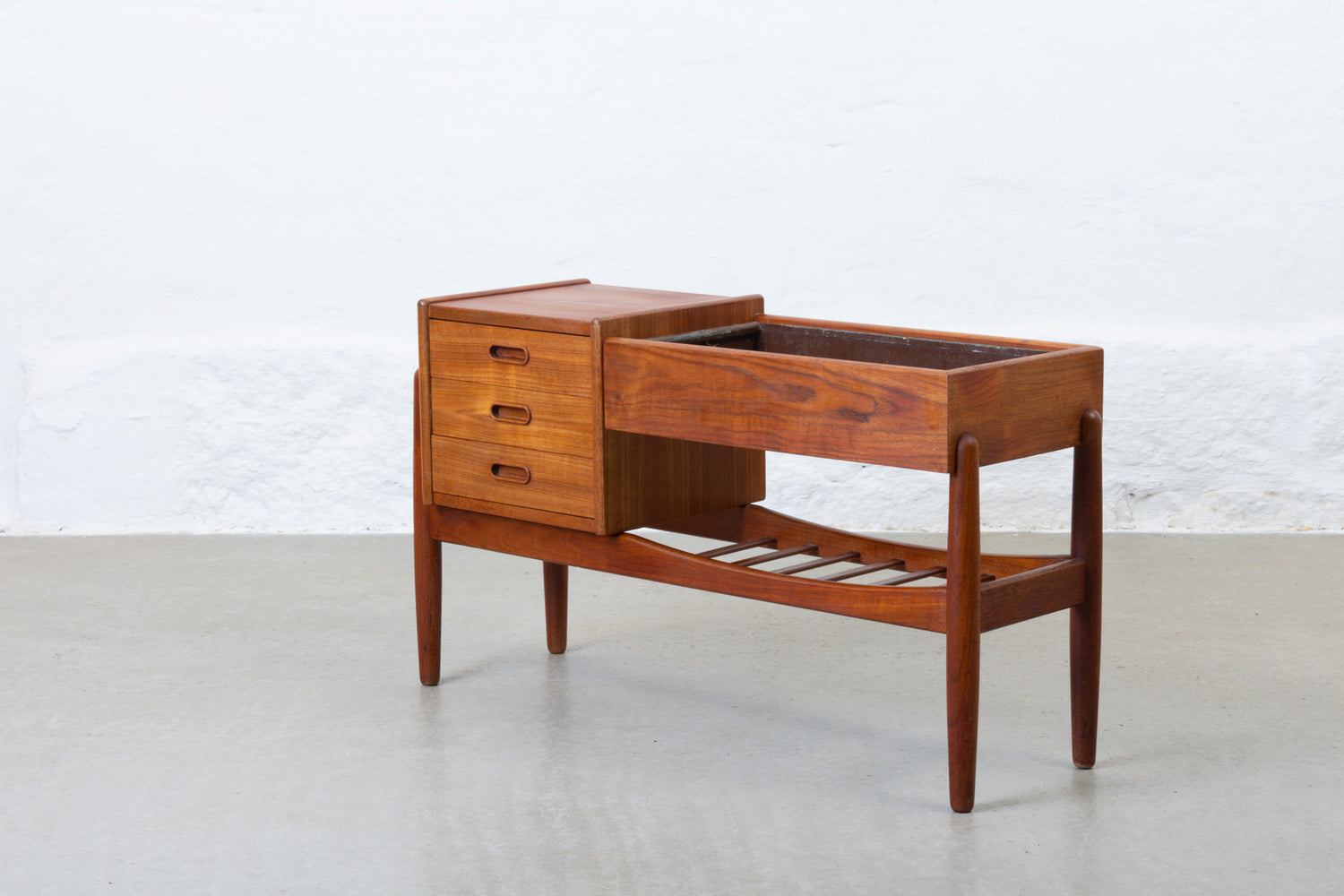Planter table in teak with three drawers, magazine shelf and removable zinc planter.