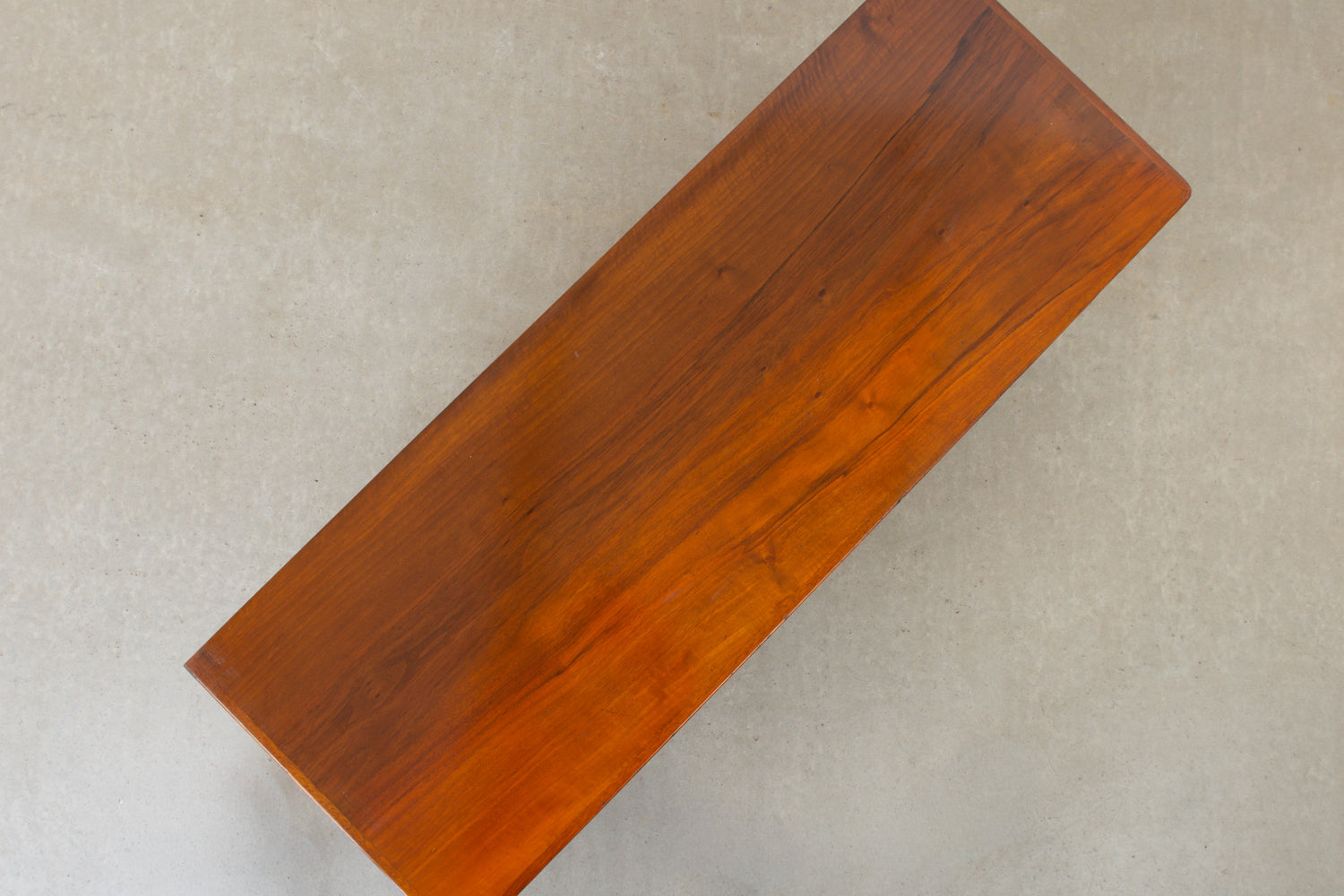 1930s-era storage unit in mahogany comprised of a low sideboard with tambour doors and a floating bookshelf with six adjustable shelves.