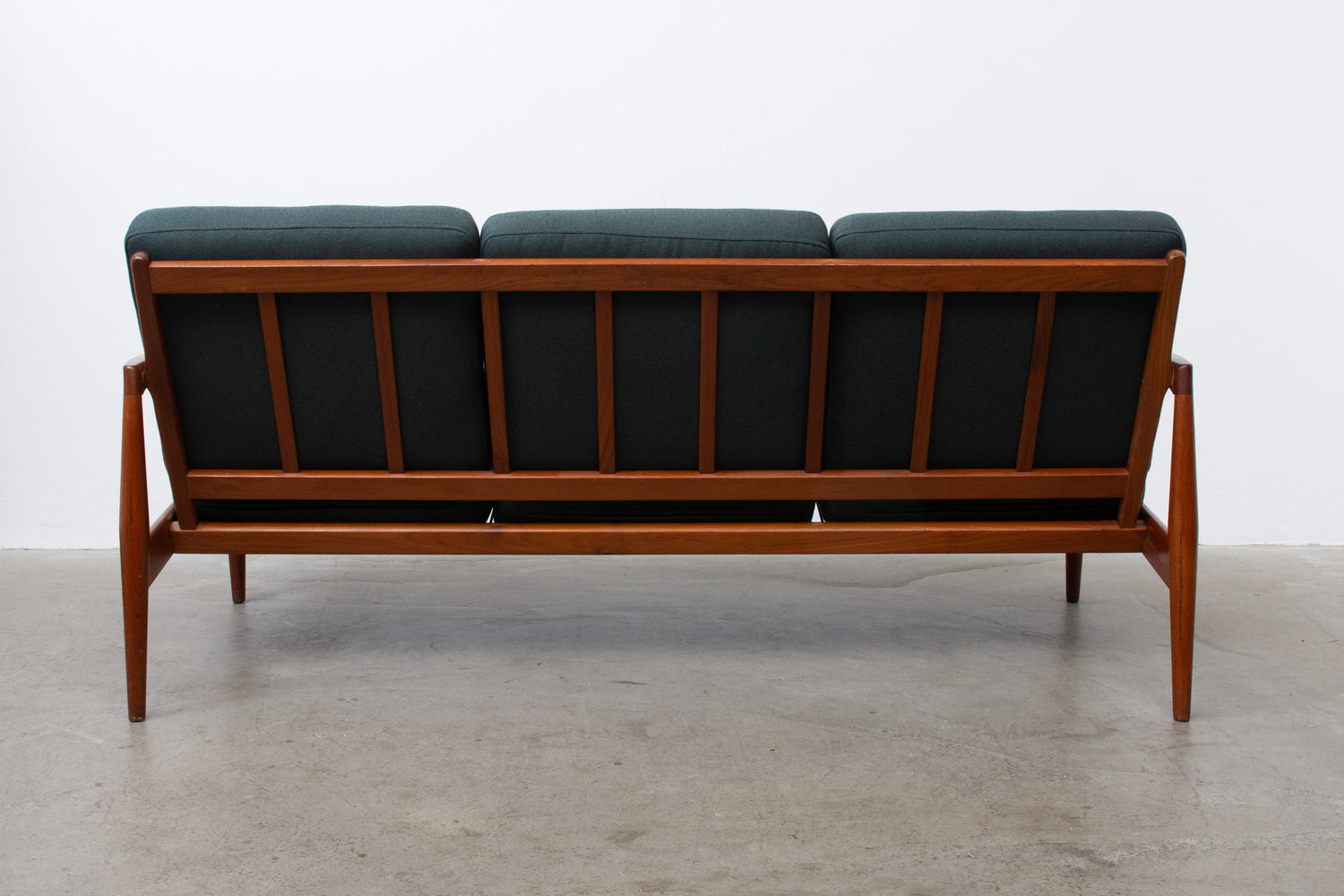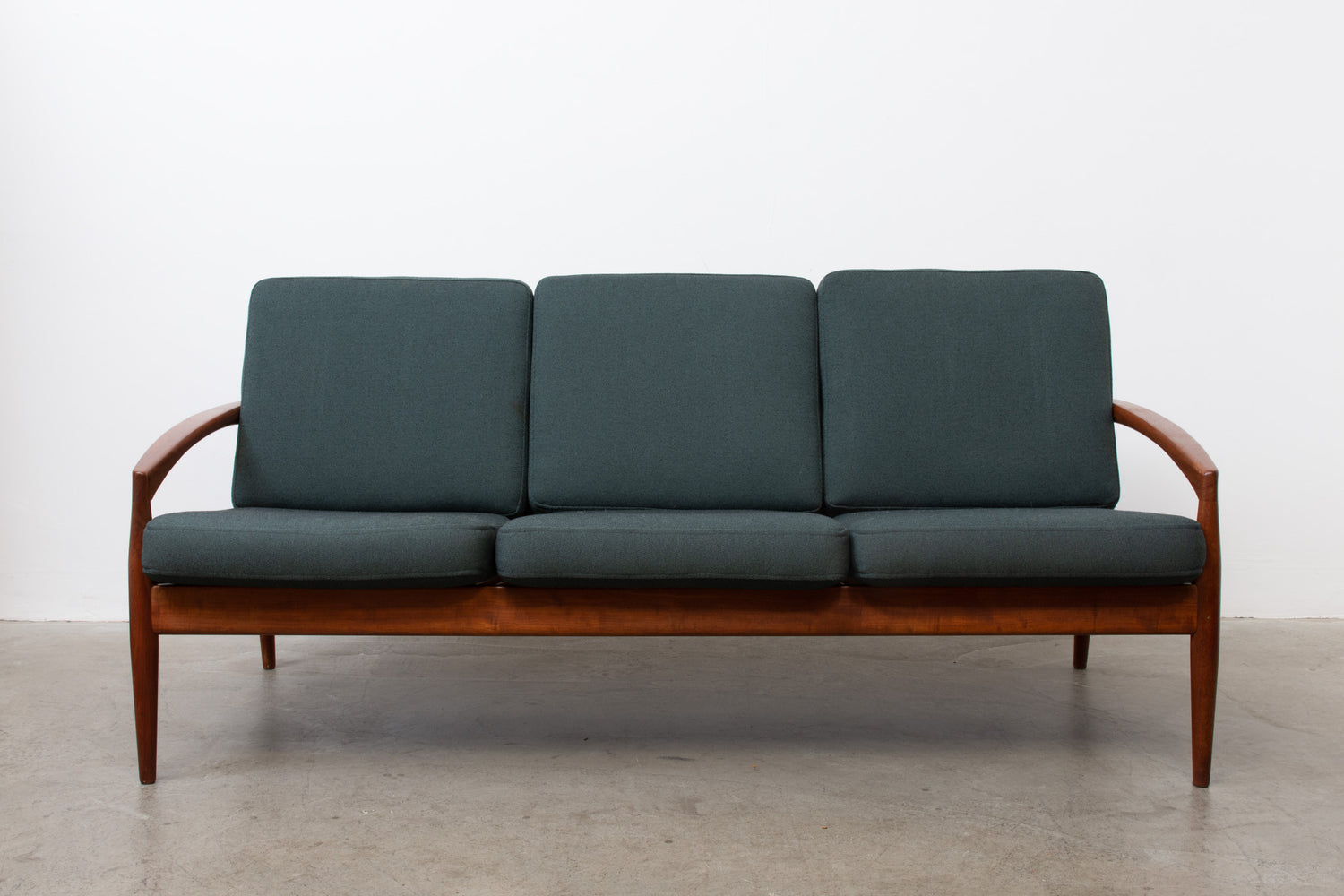 'Paper Knife' three seat sofa with a teak frame and six loose foam cushions upholstered in wool by Kvadrat.